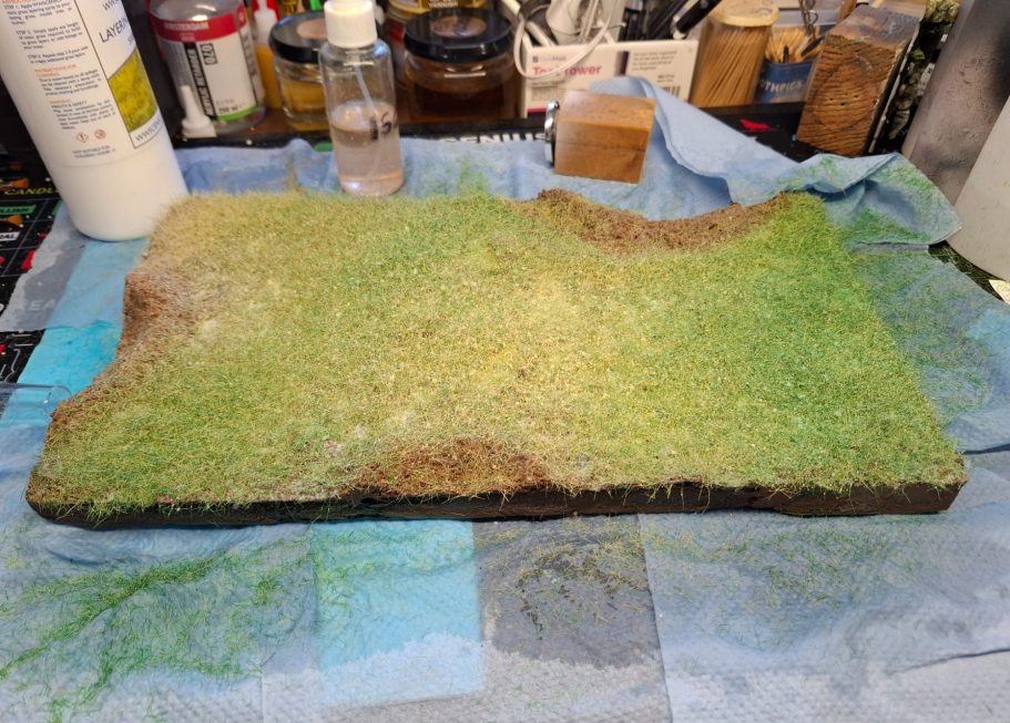 The grass is given about ten minutes to settle, and then I sprayed on Woodland Scenic’s Layering Glue and then added more static grass with the applicator.