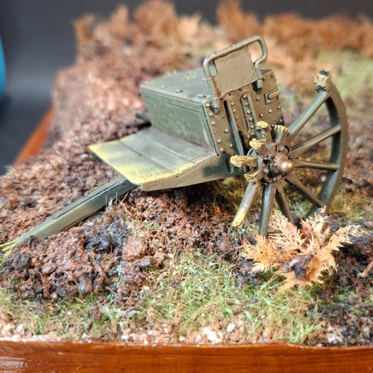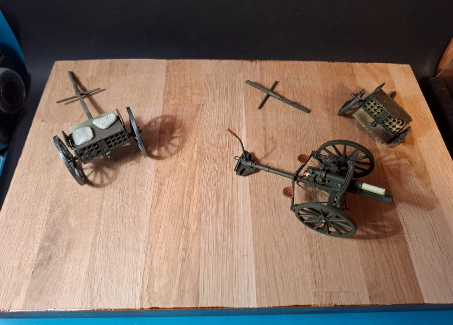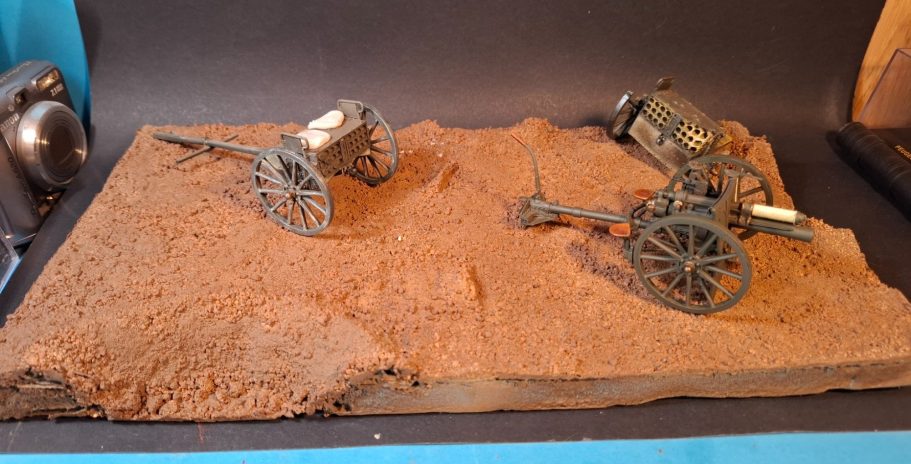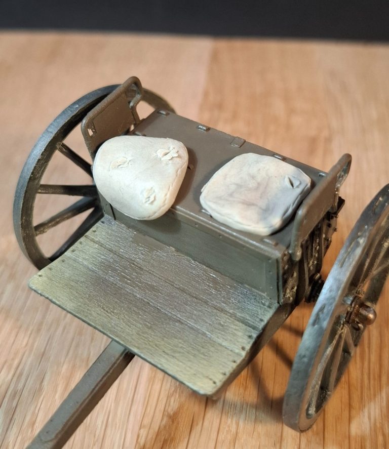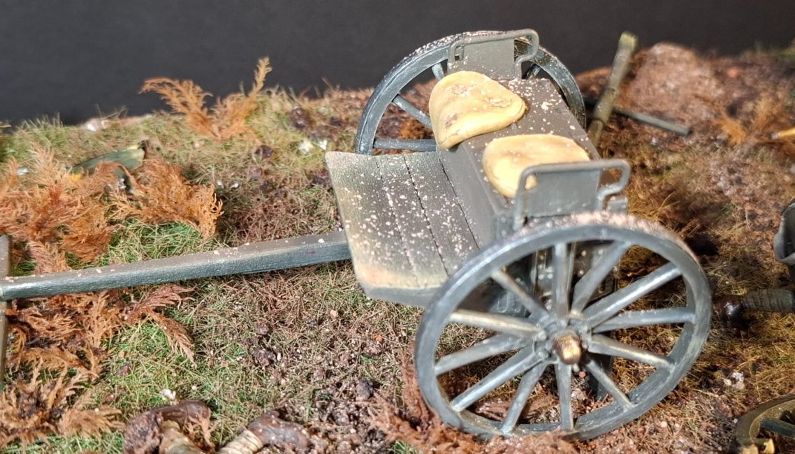 the scene is much too clean yet, and there’s a list of things to do – like damaging the cannon wheel, painting and adding the figures, adding the empty shell cases and making some discarded cushions that have been thrown off the more damaged limber.