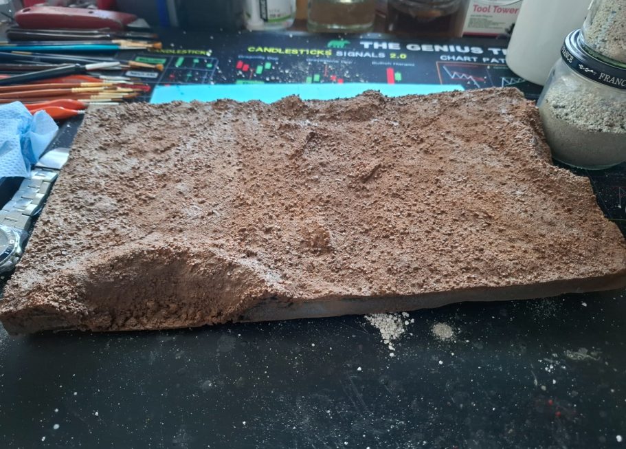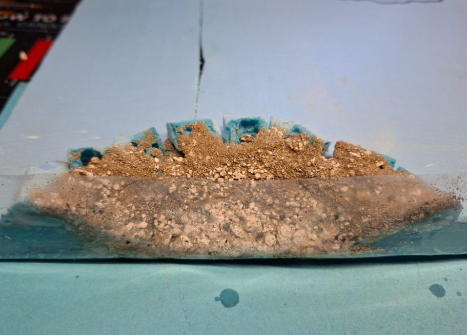 There’s all sorts of fine stones and lumps of soil in there, and this would be scattered onto the base and fastened in place with Woodland Scenics Layering Spray.