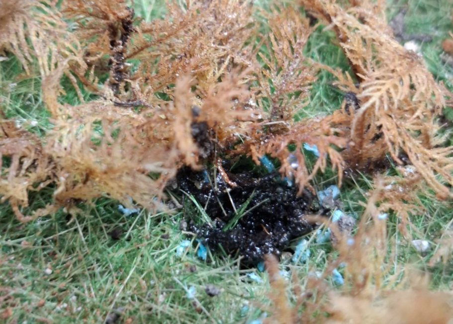 I used a basin to cover the shell craters and then began adding grass flocking material with a static grass applicator.