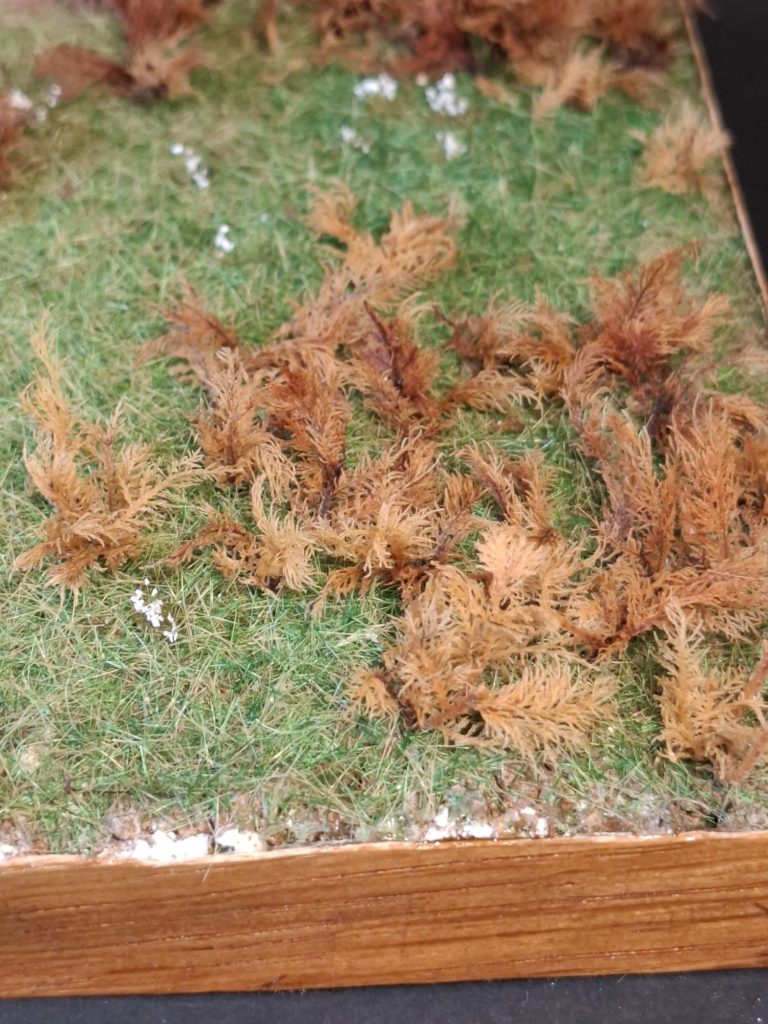 Very small sections were trimmed off the longer fronds, and fastened to the groundwork with superglue, creating sections of planted areas, with one or two that were separate as though seeds had been blown away from the main bunch.
