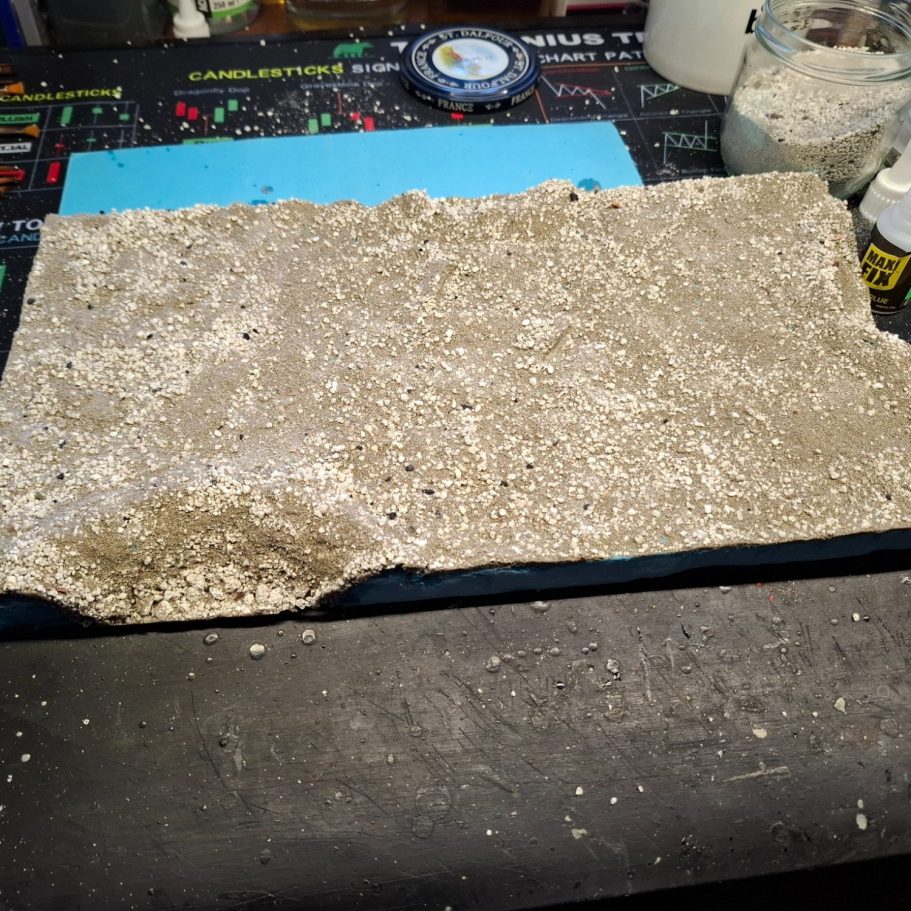 Photo #33 and I’ve begun adding the sand and cat litter. This is fastened in place with thin superglue, dripping on small amounts and avoiding any fumes.