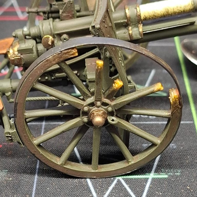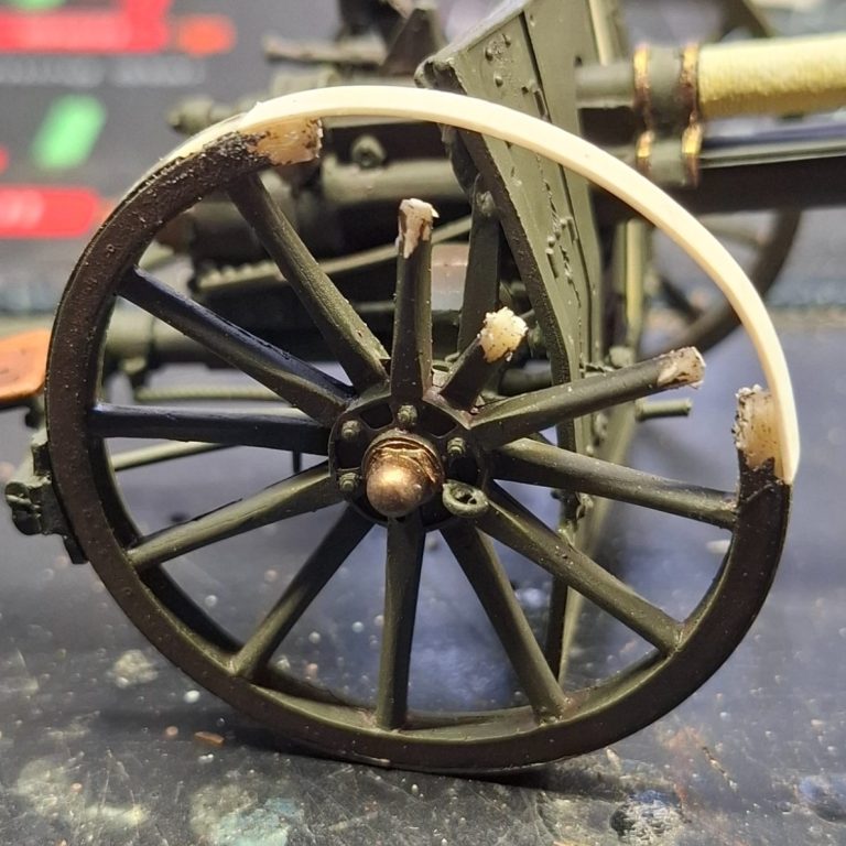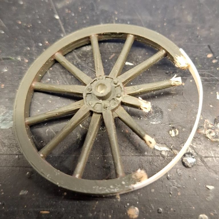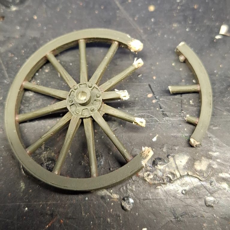 Each spoke and the ends of the wheel rims were made to look like the wood was splintered with a scalpel, and I carved a small section of the remaining wheel rim away so I could add the section that seems to have remained intact on the museum display.