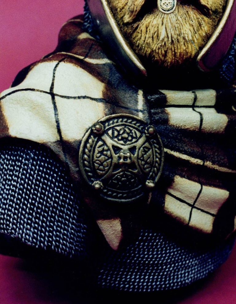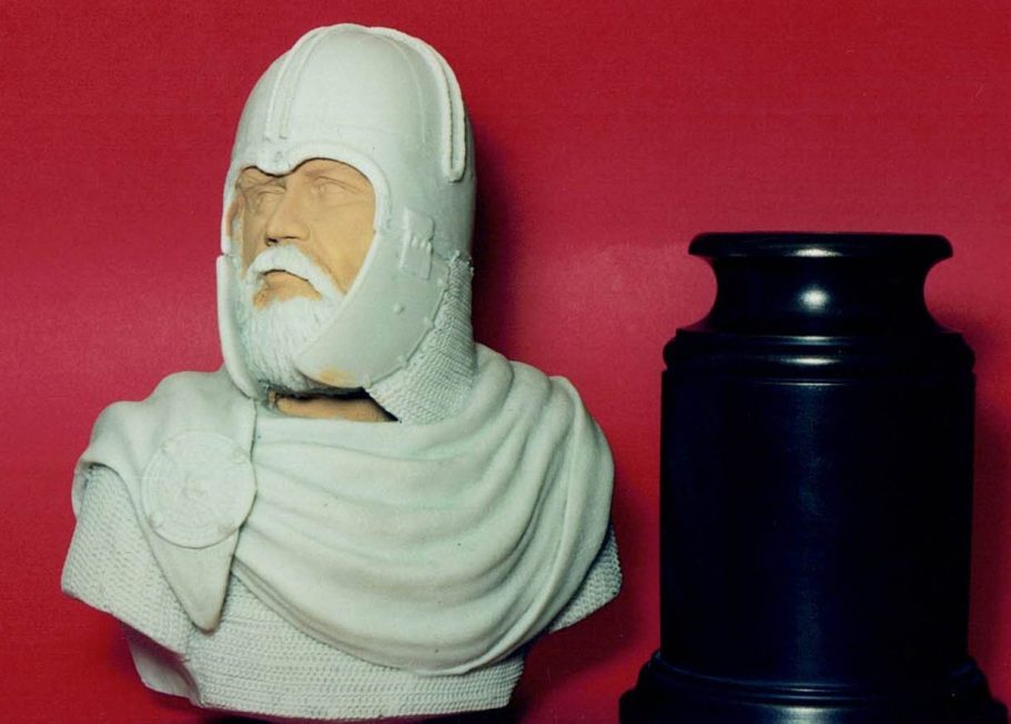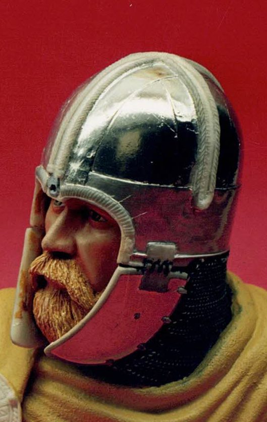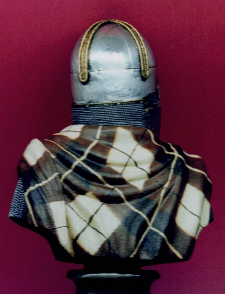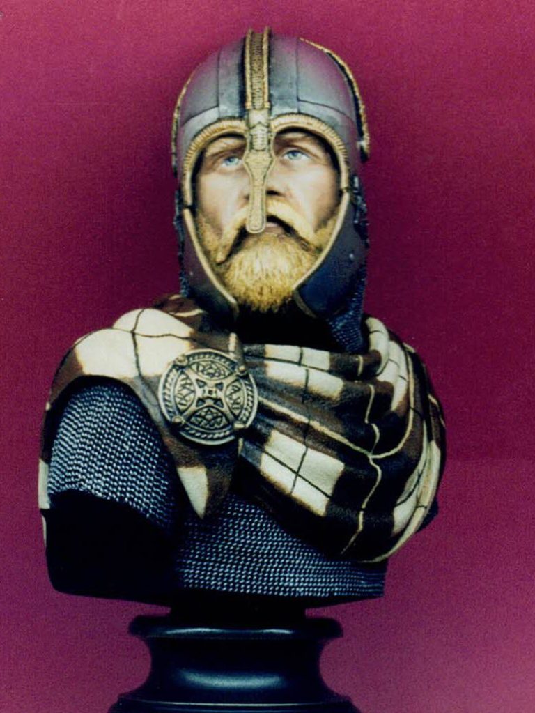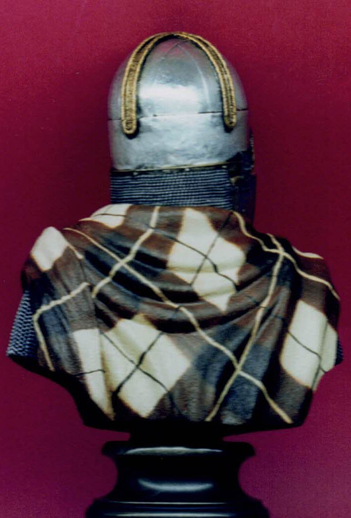 All that remained to do was to paint the underside of the bust black, using a fast drying acrylic, and glue the nasal guard in place with a spot of superglue. Then I attached the base to the bust using a piece of dowel sunk and glued into holes in both bust and base, the glue used being waterproof wood glue. After adding a nameplate to the base the model was complete, I could sit back and admire Dave Gerretts' masterpiece.