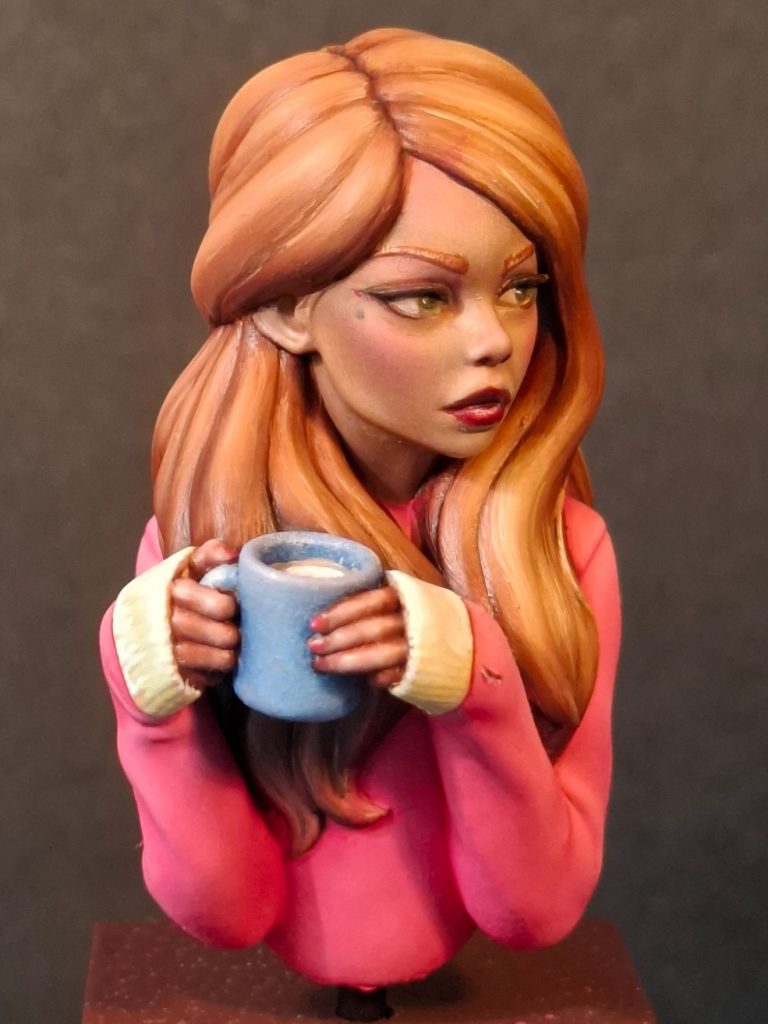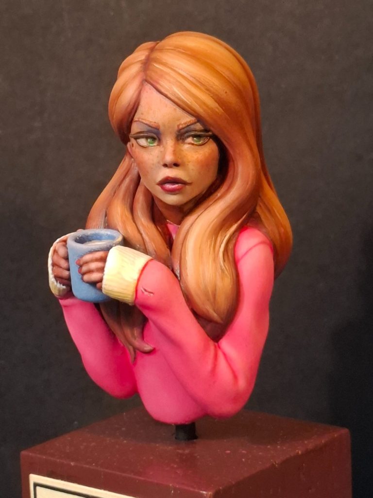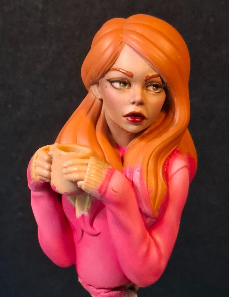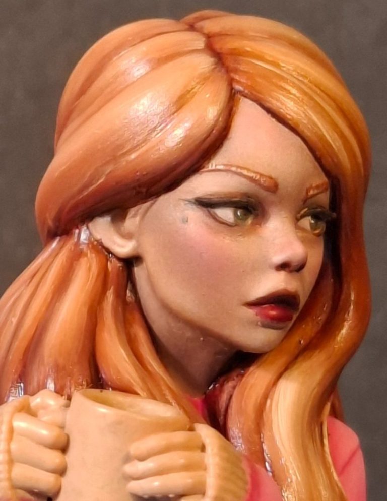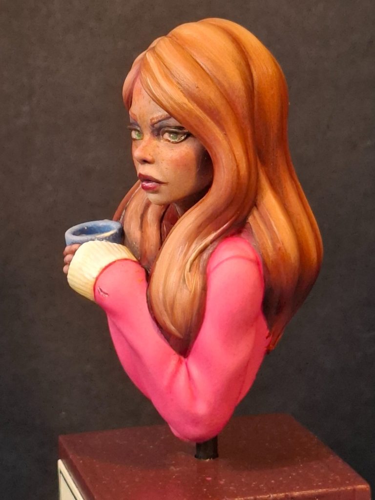 The hair was undercoated with MP paints Rust acrylic, to see how the ginger colouration would work, and to “frame” the face to check if that was working OK.