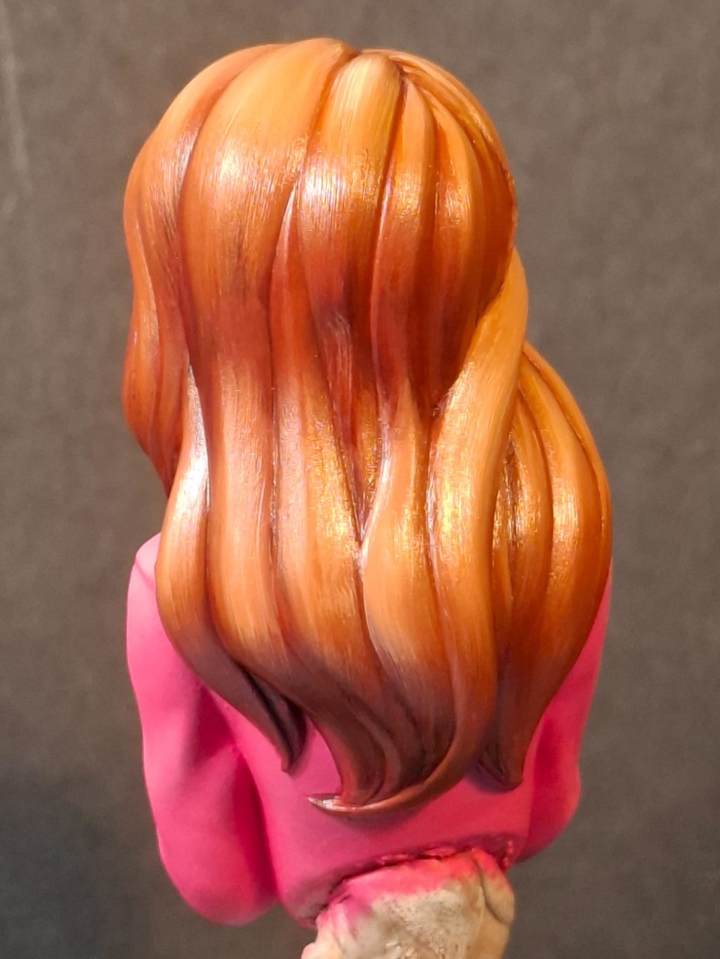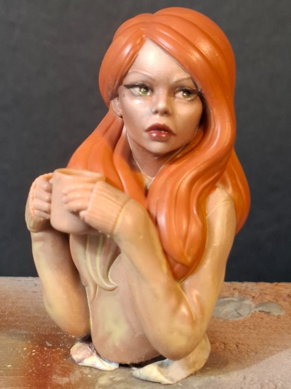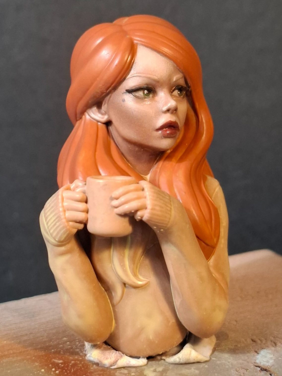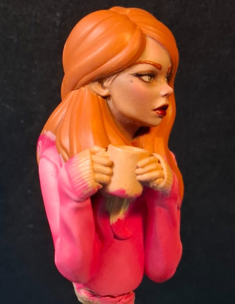 The hair was undercoated with MP paints Rust acrylic, to see how the ginger colouration would work, and to “frame” the face to check if that was working OK.