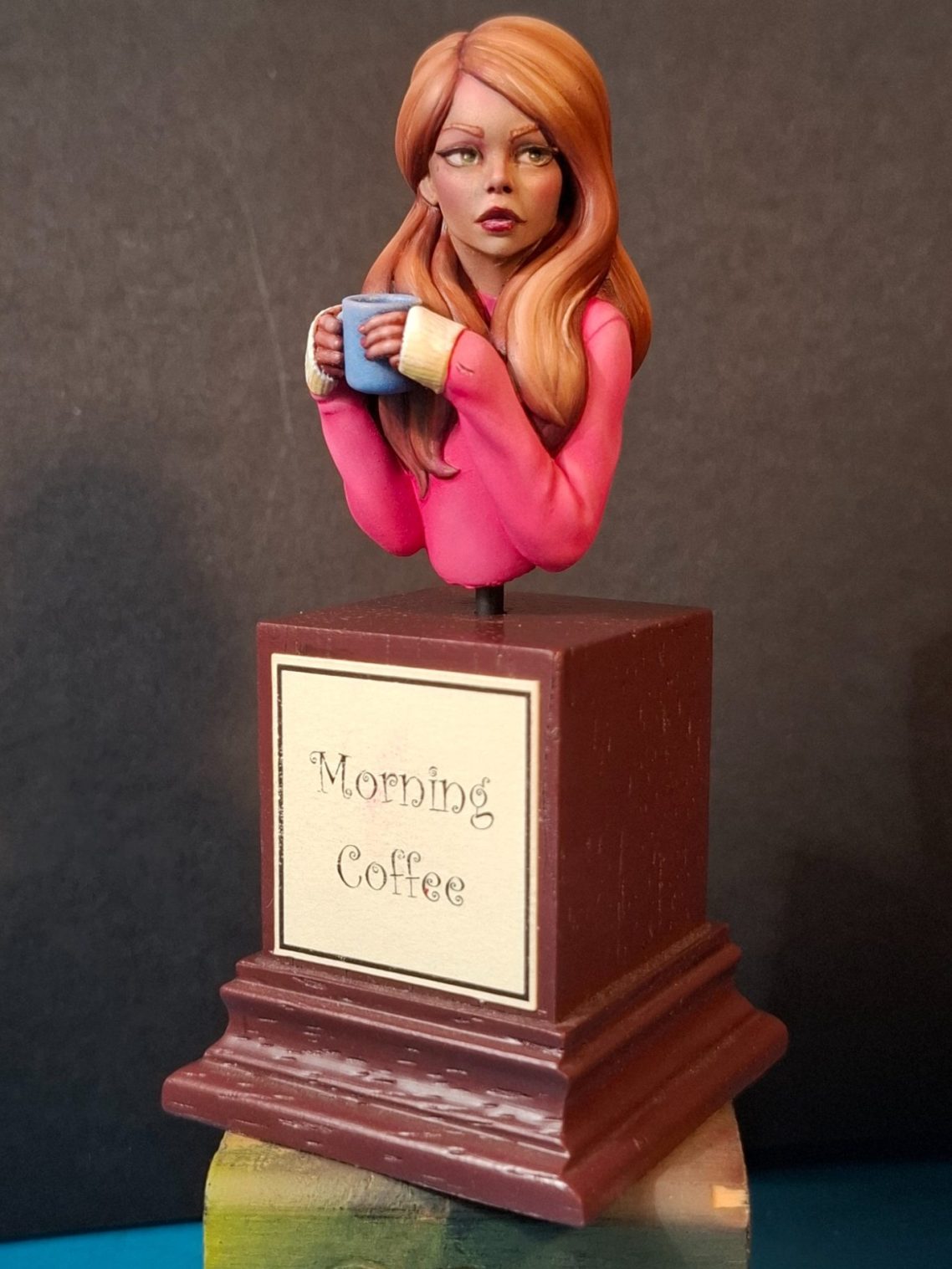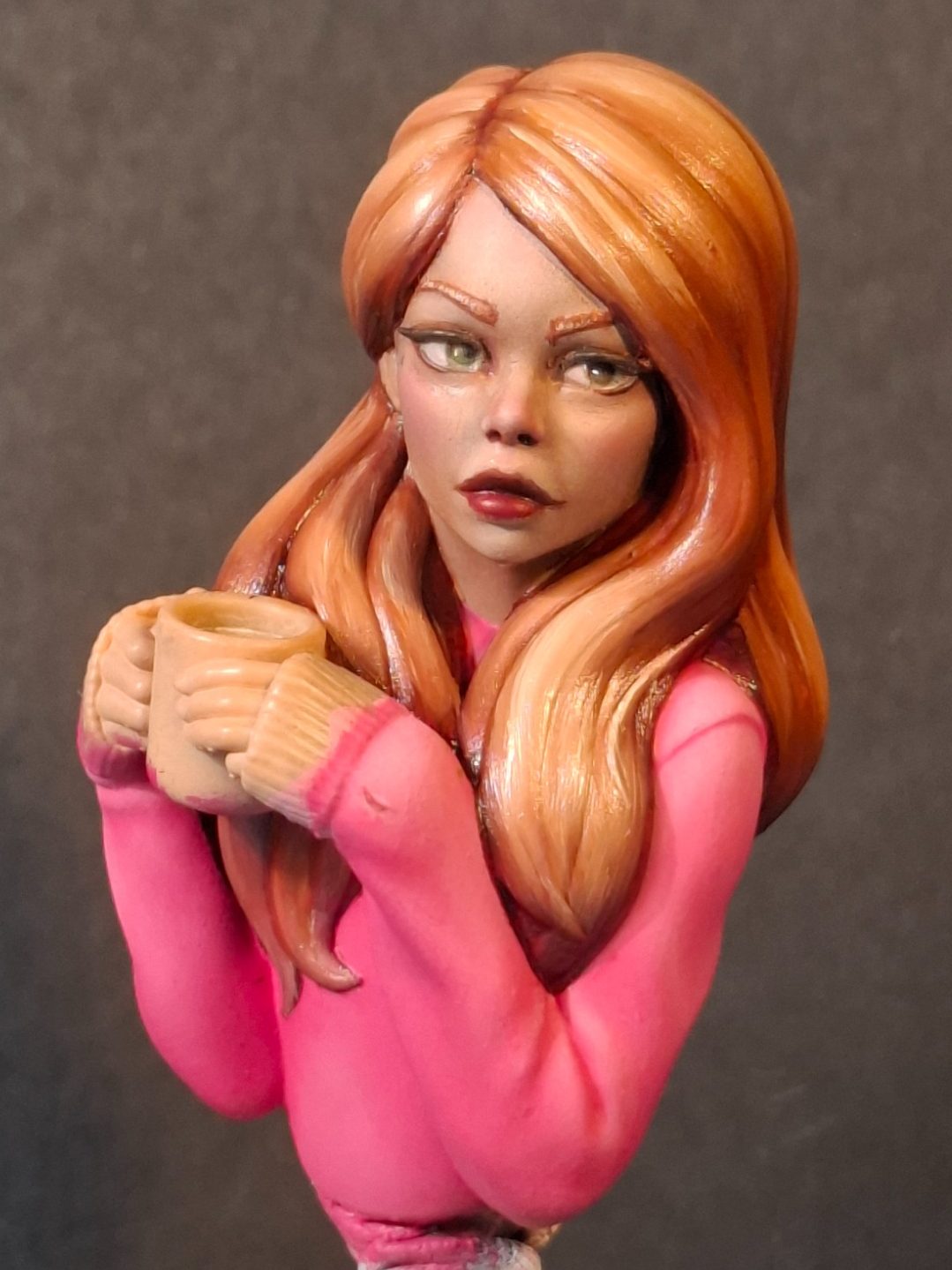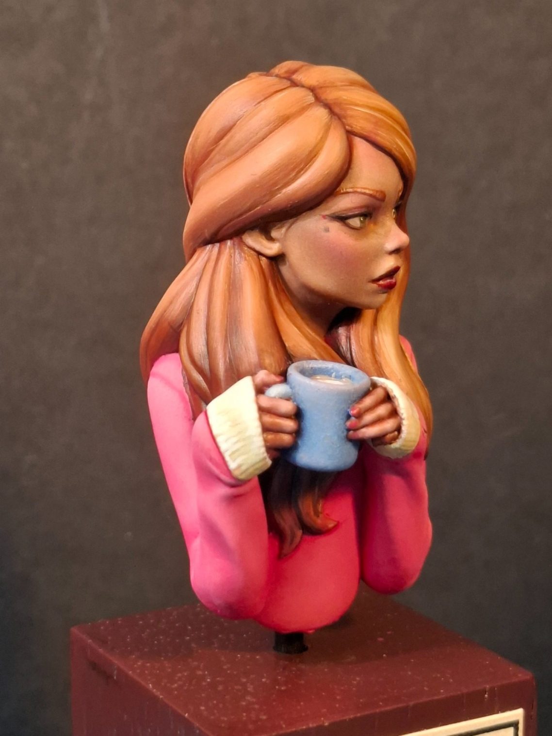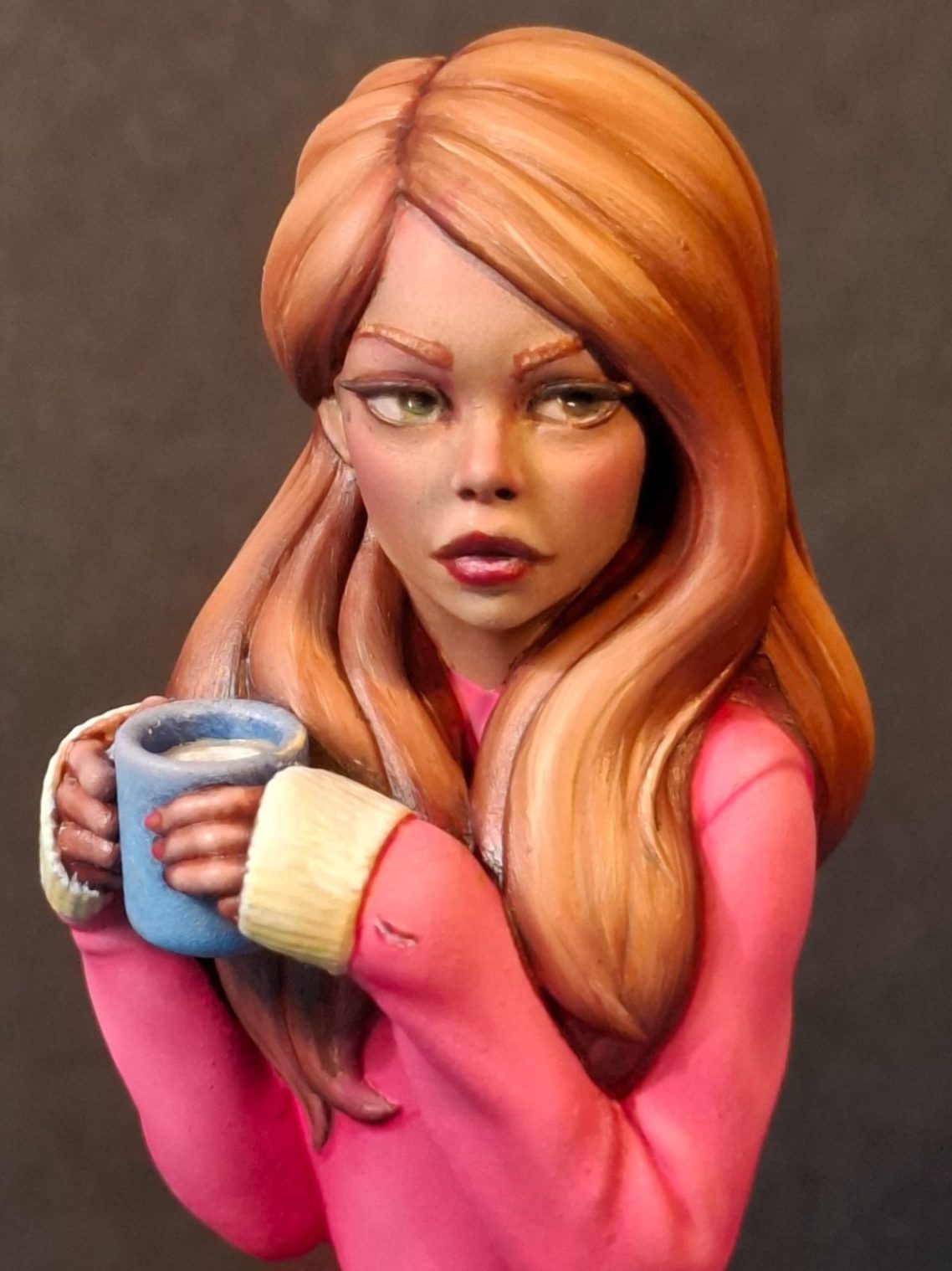 Photo #12 shows the model finished. I needed some blue to help contrast all the pink and rust already on the model, and the cup was perfect for this.