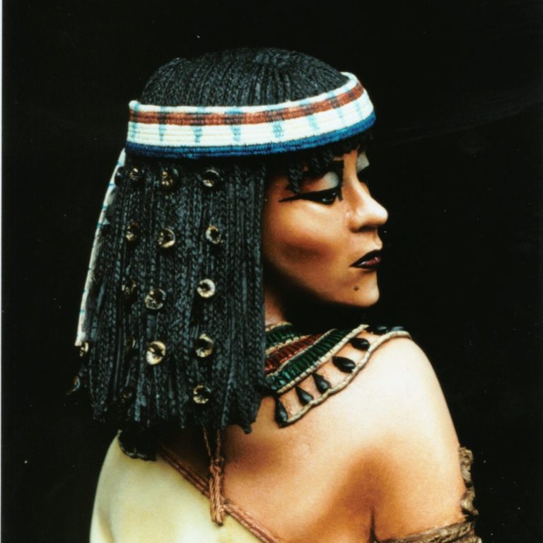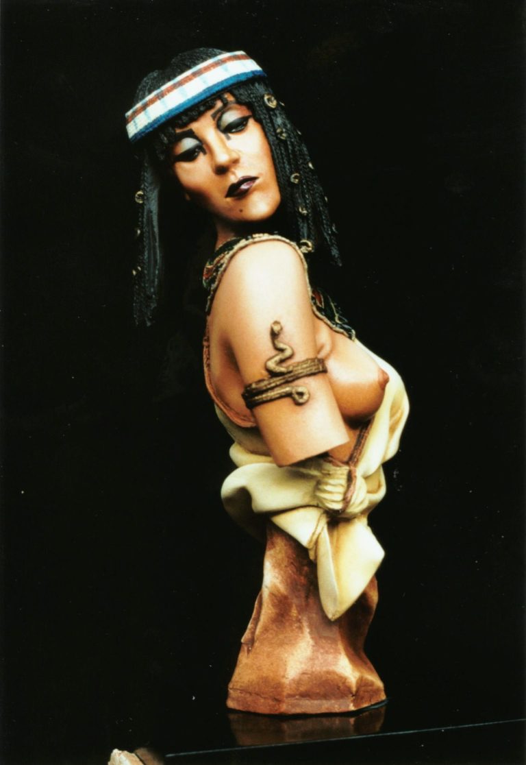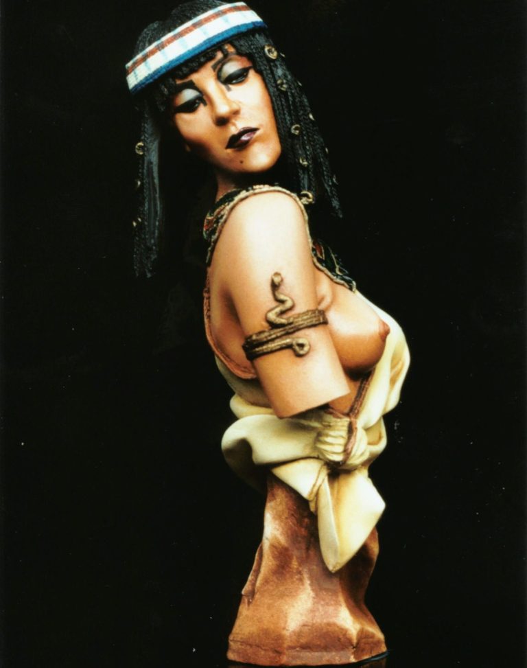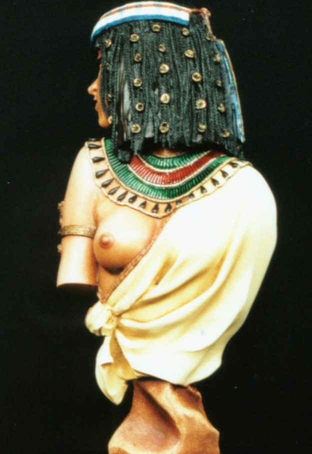 The hair is black acrylic, followed by black oils, with highlights for the un-braided hair in Mars Brown. I found this quite difficult to do, and had to repaint the hair a couple of times, as the Mars Brown is quite a dominant colour, and tended to take over from the black if I wasn’t careful. Highlights on the braiding were added from very small amounts of the basic flesh mix, dry brushing these on to pick out the detail.