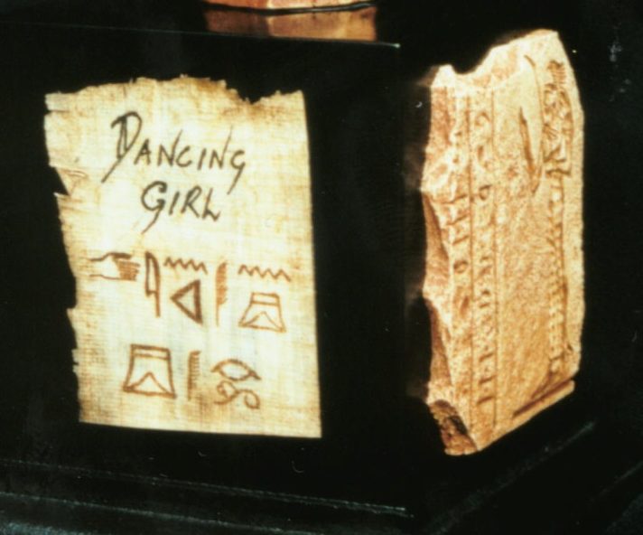 I used pictures from my reference sources on ancient Egypt as a guide, these same sources giving rough translations of what the individual hieroglyphics mean, which enabled me to spell out "Dancing Girl" on the nameplate in both English text and also Hieroglyphs.