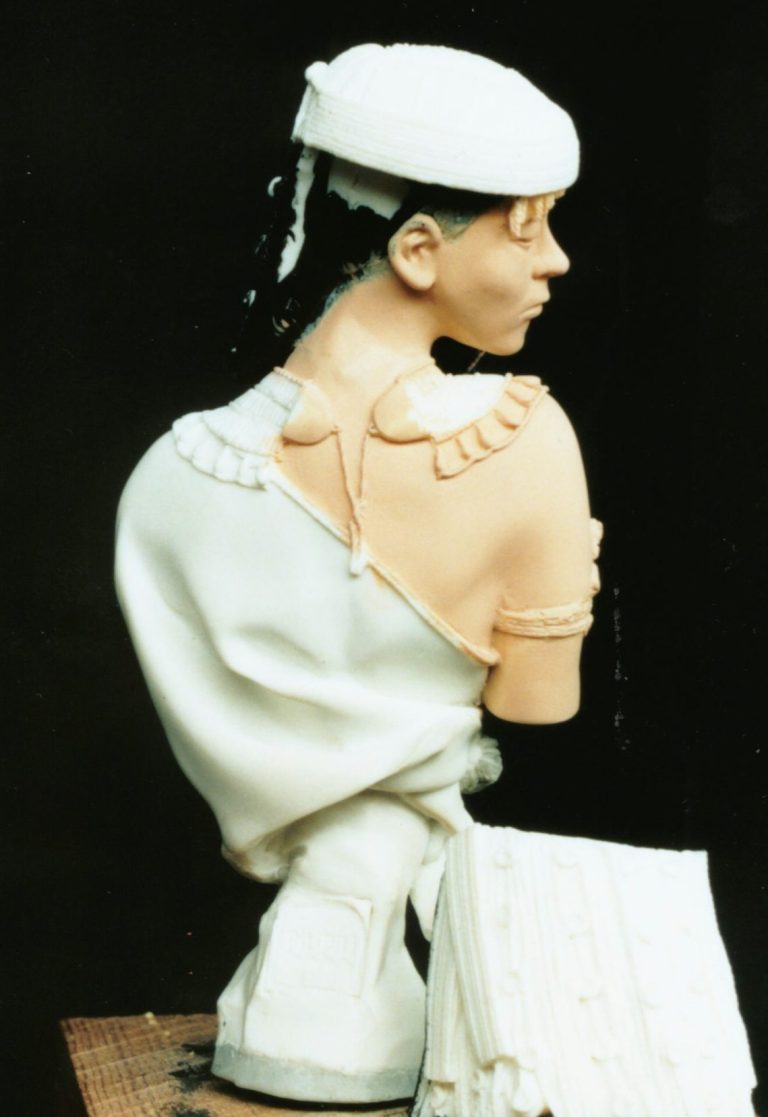 In photo #2 I’ve shown a rear view of the figure, and this shows how I continued the black acrylic around the back of the head so that when the separate hair piece is glued in place, there’s no possibility of the bare resin showing.