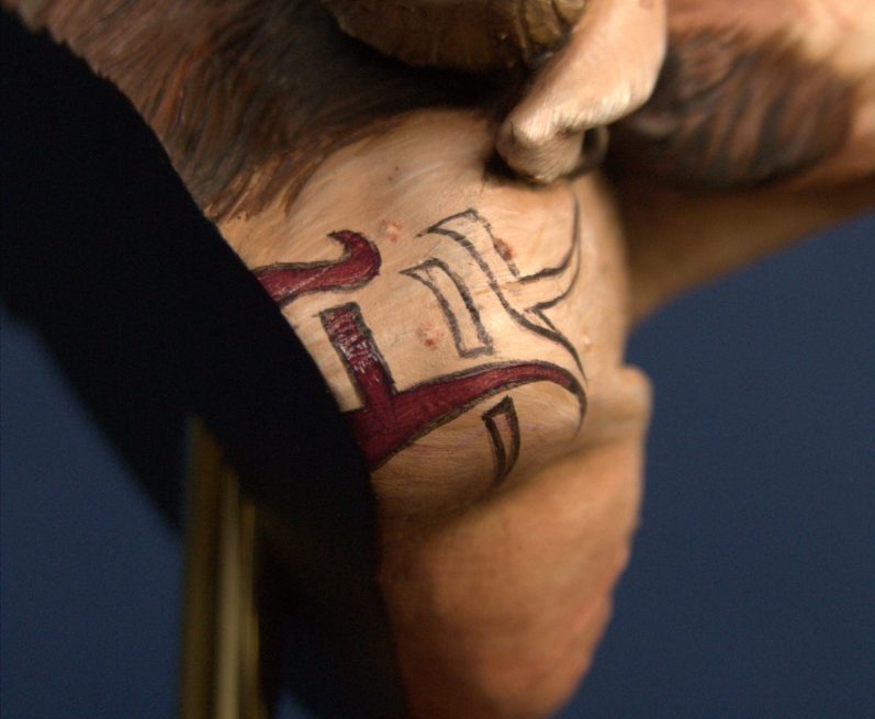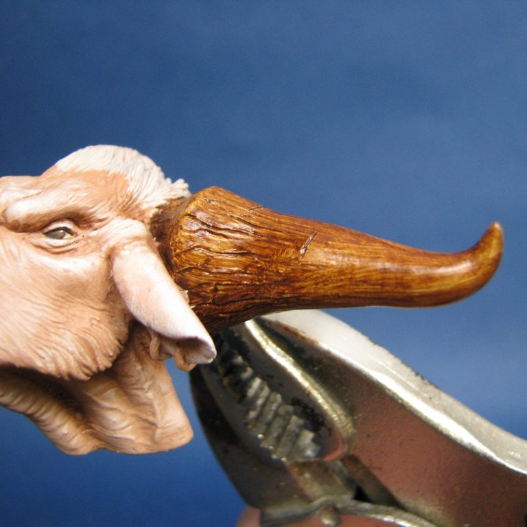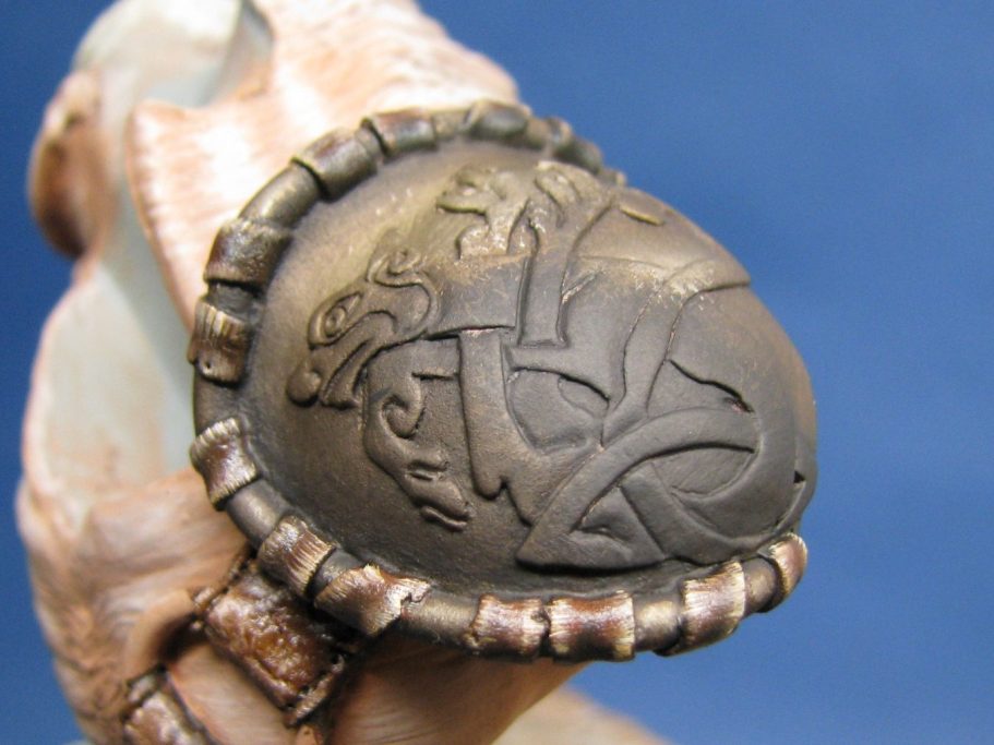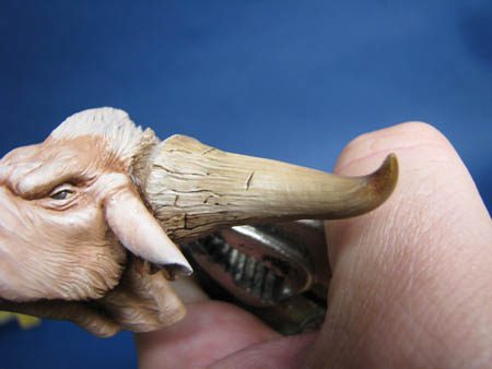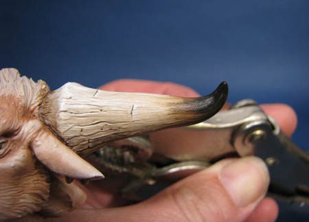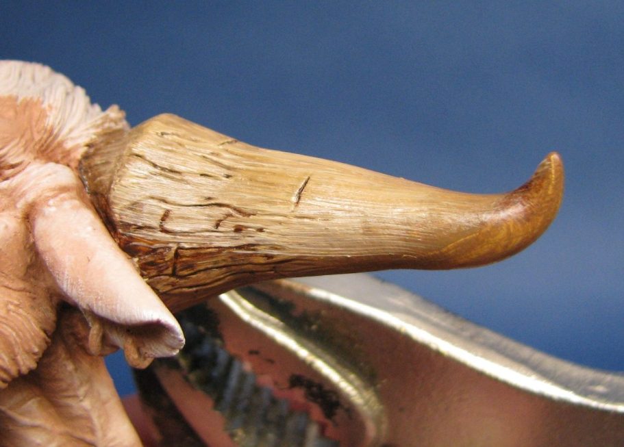 The main focus of this shot though is the beginning of painting the horn. I’d begun with several coats of an ivory coloured acrylic – enough coats of paint being built up to give a solid colour. Then in this shot I’ve added a coat of Burnt Umber oils thinned with a little White Spirit to allow the paint to get into all the recessed detail.