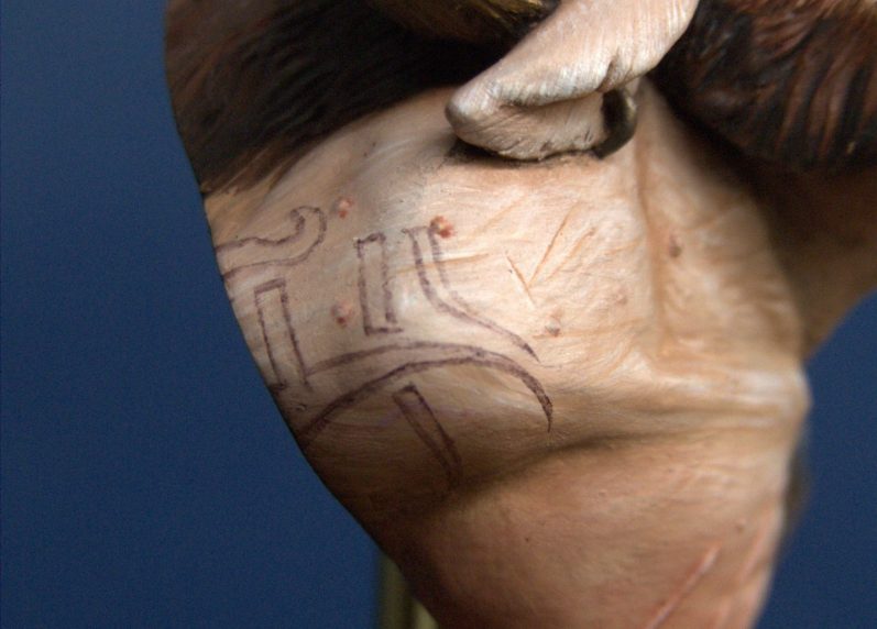 In photo #15 I’ve begun adding the tattoo on the shoulder. It’s not a design that I’ve seen represented on ancient pottery or anything, just a doodle that looked a trifle tribal.