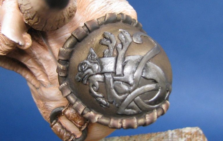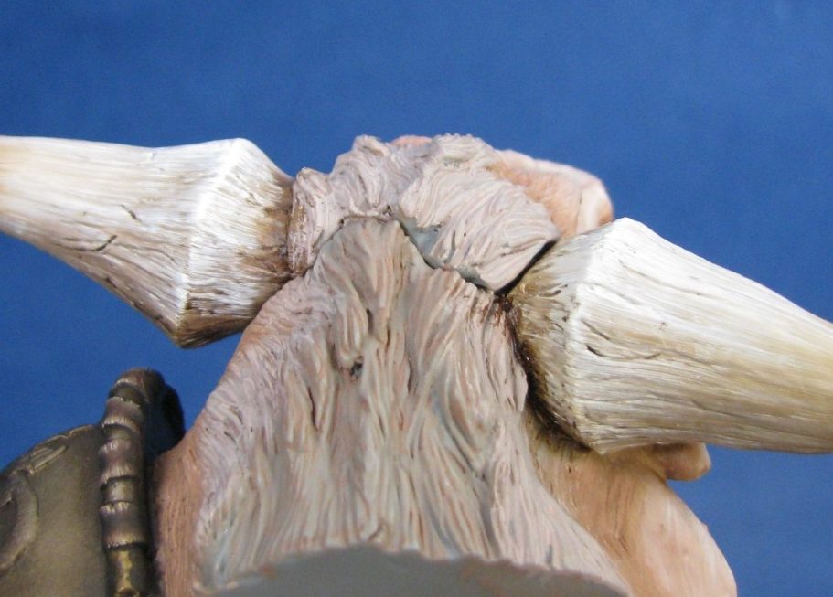 Because of the simplicity of the bust, it gives me the chance to focus on a couple of areas and how they were painted. These areas would usually be a lot smaller – the horns, the armoured shoulder guard and the belt for example, so close up shots show more of what was done to get the individual effects.
