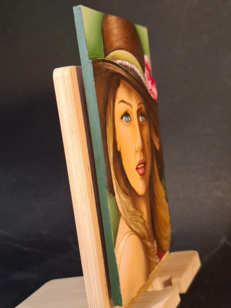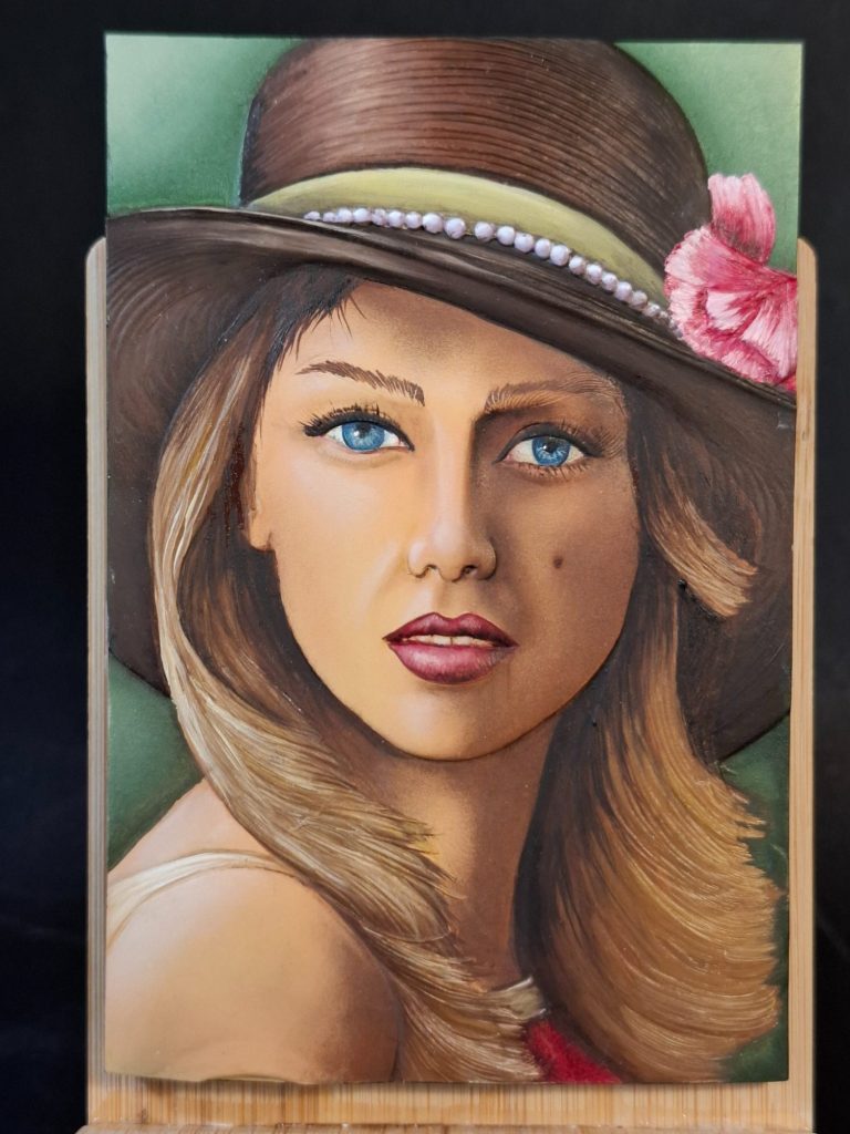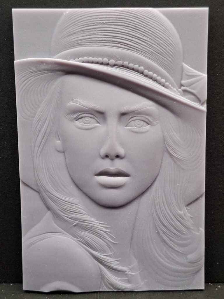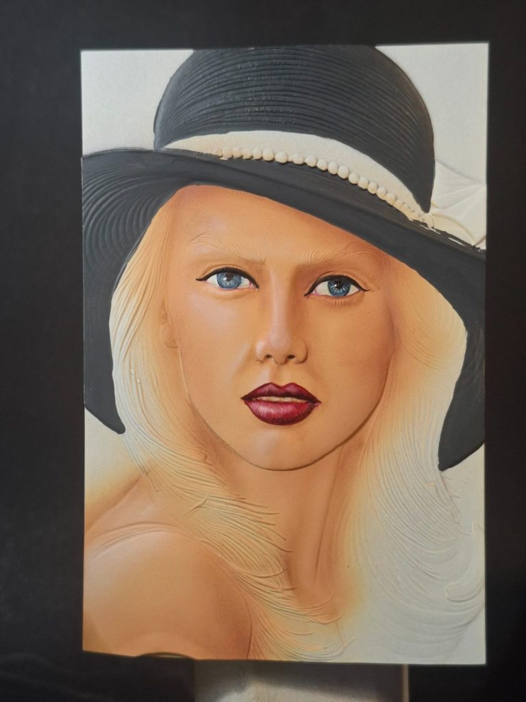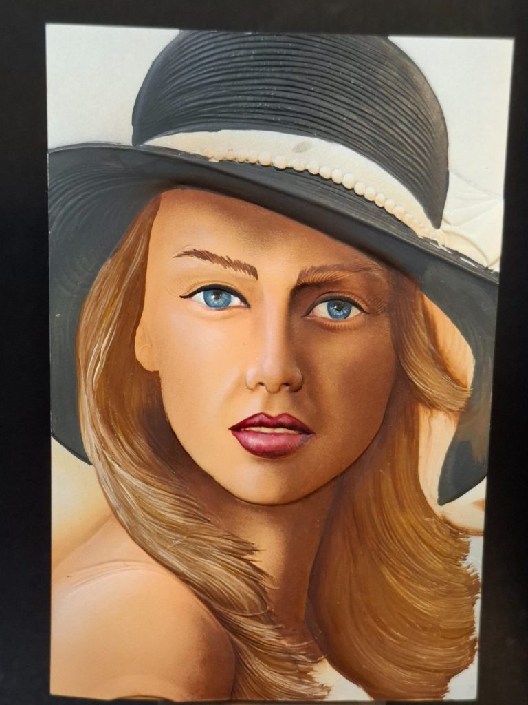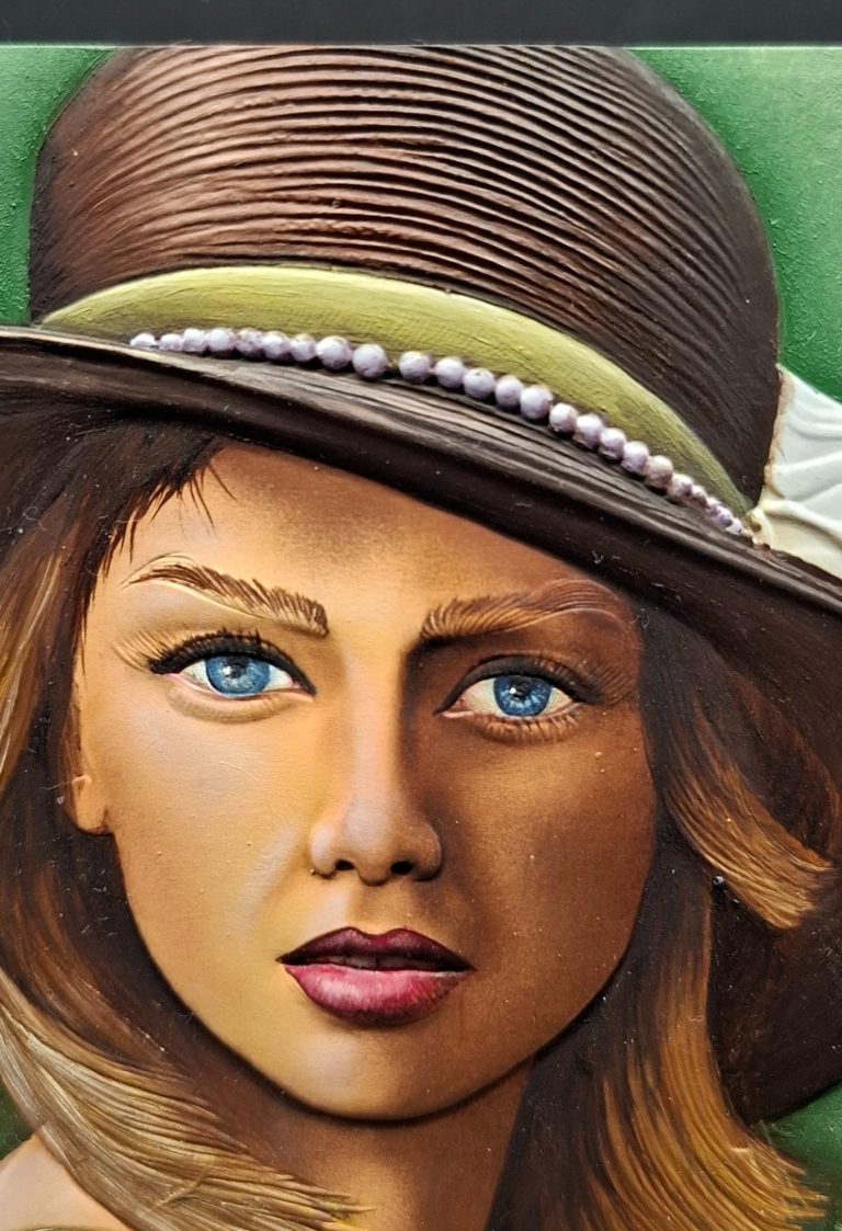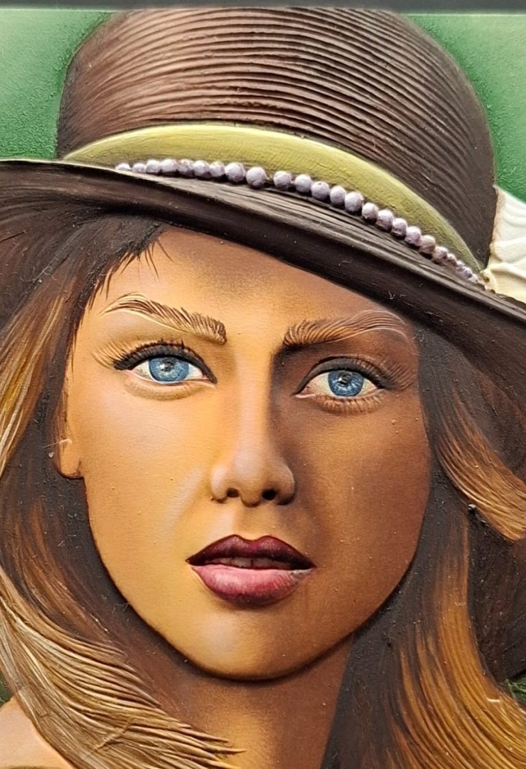 The hair at her right temple needs bringing forward a little. I followed what I thought the casting was embossed with, but on contemplation, the hair is too far back. Again, this needs correcting and then I can start working out if the hat is casting a shadow across the face too.