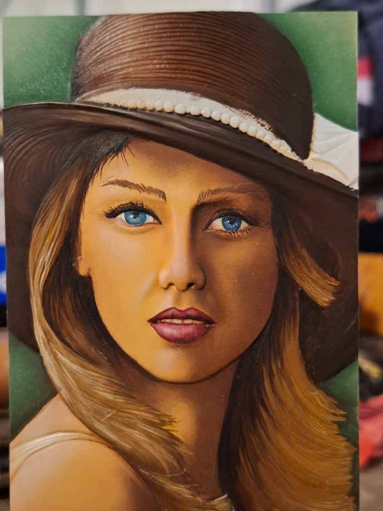 The pale green on the hatband is a mix of Olive Green and Mars Yellow oils, gradually lightened with Titanium White and finally deep shadows added towards the edges with the original mix plus a little black.