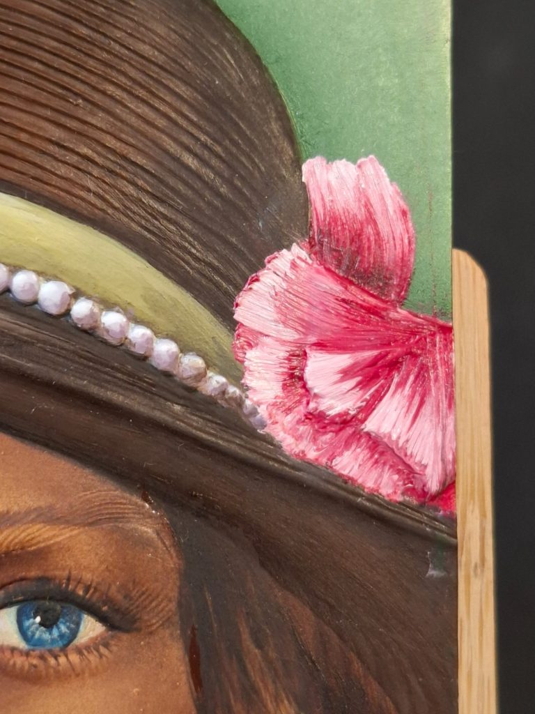 The lips, these were painted in a conventional manner, I used Purple Alazarin oils as a shadow colour and added Carmine and then some Scarlet. The glossy shine was built up with very small amounts of Titanium White, spreading the bristles of the brush to be like a fan, and wiping the brush on a cloth after each stroke.