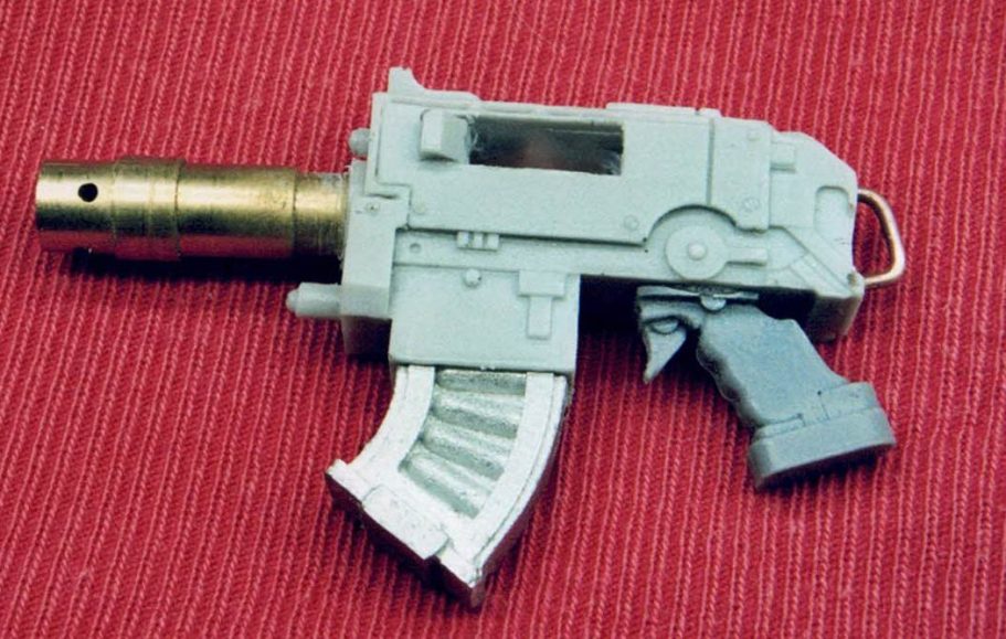 With the smaller hand bolter I’ve added a new barrel using various diameters of brass tube slipped one over the other and a wire handle at the back to lift the gun when suspended at his side.