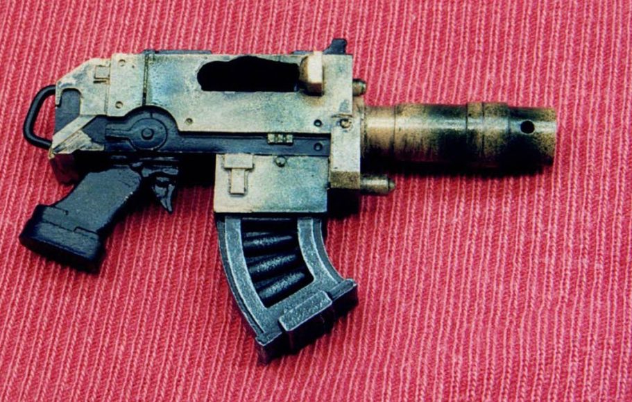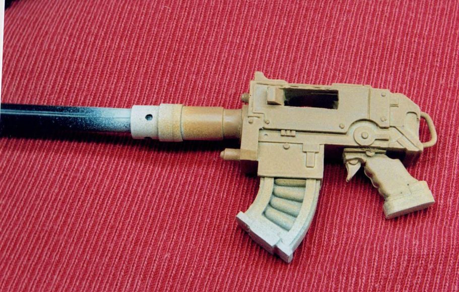Photo #3 shows the painting finished, thin stripes of Nato Green and Black, both from the Tamiya paint range and applied by airbrush, with metallic colours lightly drybrushed over the magazine and GW Chaos Black acrylics applied to the handle, trigger and lower body.