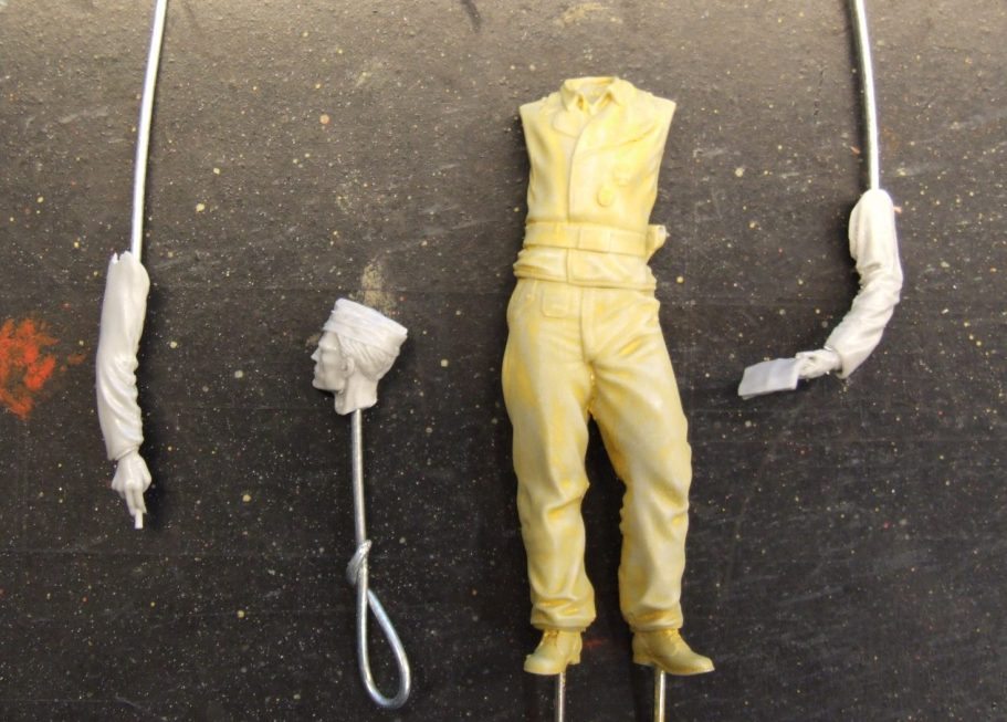 He used to fasten them on with Pritt Stick glue, which was strong enough to hold a 1/35th scale resin or plastic figure in place, but allowed them to be removed without marking the AFV’s paintwork.