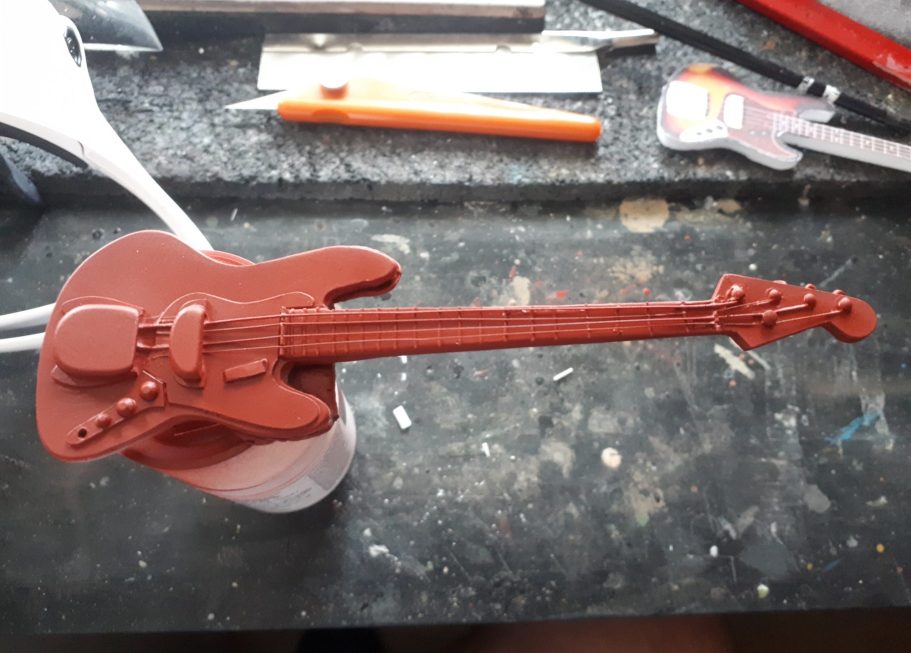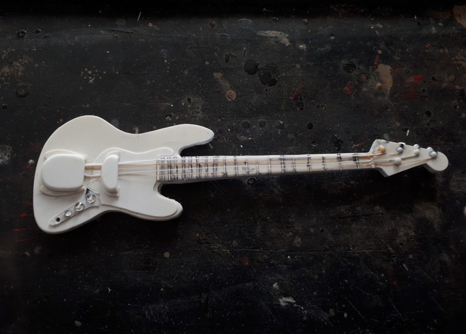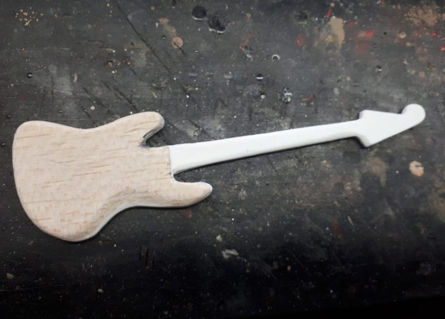 The guitar has been painted in full now, although you can only see the pale woodgrain of the neck and the Molotow chrome that’s been added to the tuning pegs and their plate along with the small plate on the body.