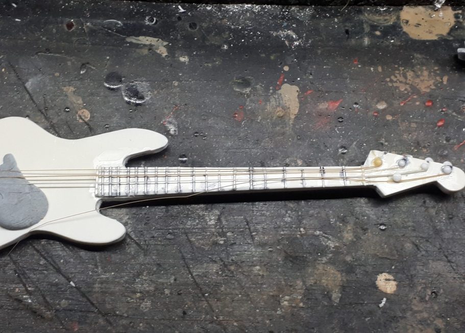 Photo #12 and the guitar is complete and ready for painting. The different sections have been added to the body from plasticard and stretched sprue, and those pesky strings keep looking saggy and not at all under tension. I restrung the bottom three strings shortly after this picture was taken.