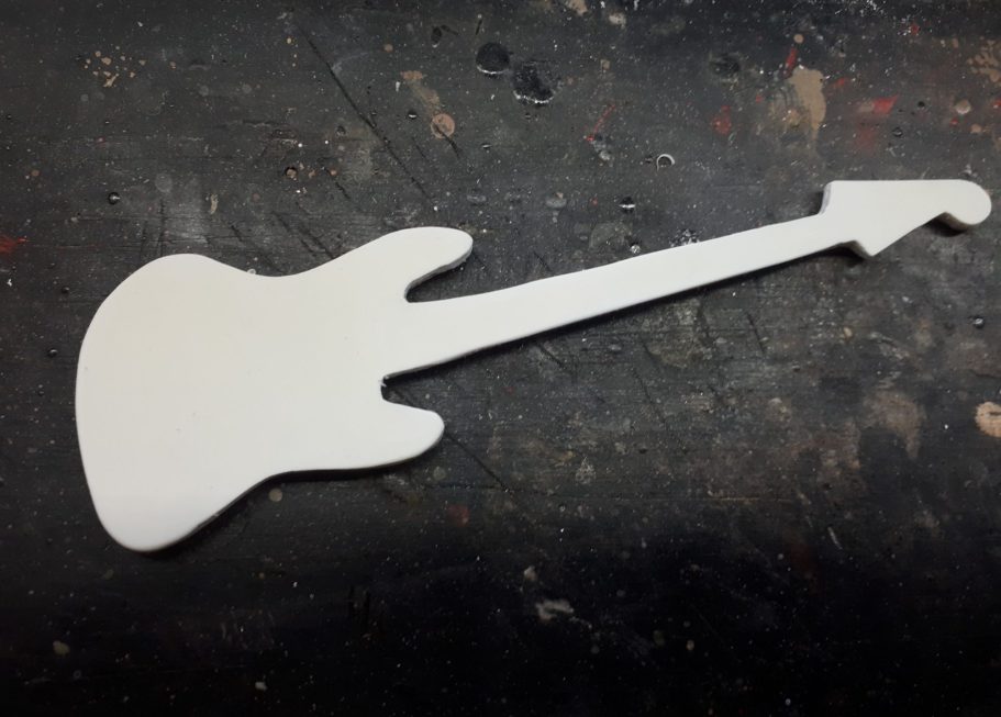 Photo #5. For the front of the guitar I used a 3mm thick piece of plasticard as a base to add everything else onto, and the shape is shown, still needing a little refinement, in this shot.