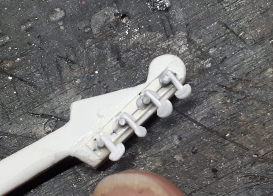 I’d already added the frets to the front of the neck, again using pieces of stretched sprue for this and trimming the edges once the glue had dried.