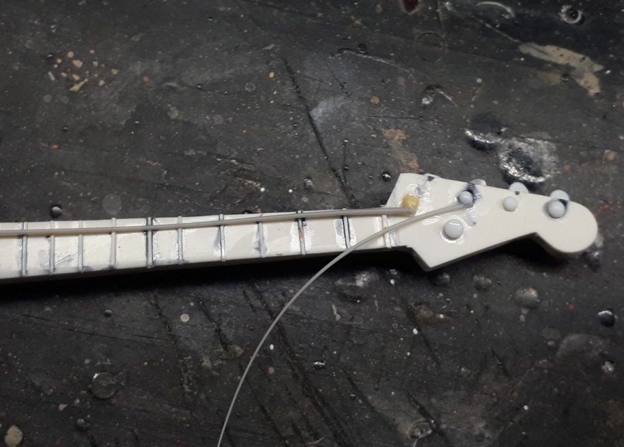 Photo #9 starting at the headstock of the guitar to string it I used stretched sprue ( a mistake, but I’ll come back to that ) to form the strings, noting that the top one is the thickest, and gradually using thinner sprue for the three strings below it.