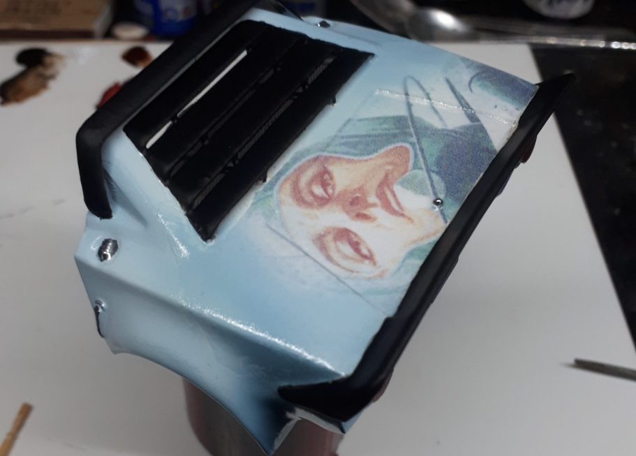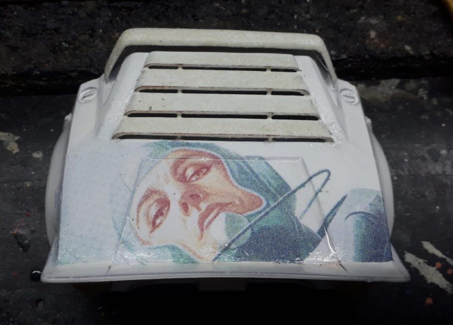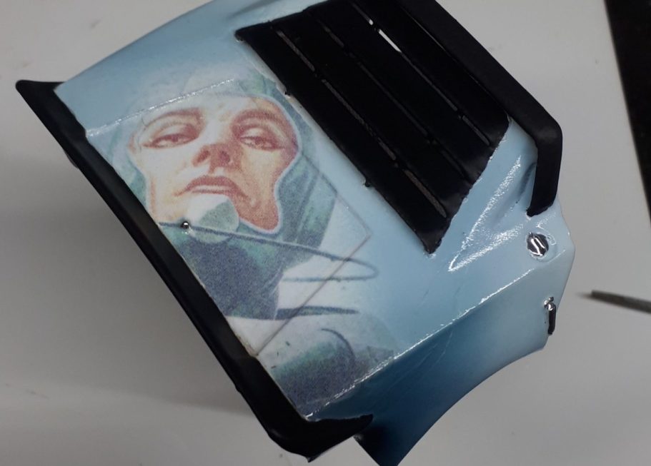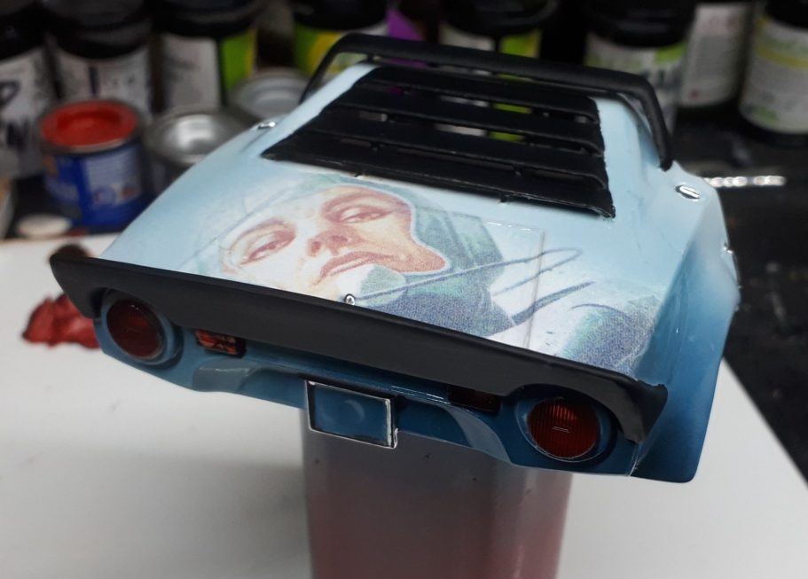 The roof and bonnet have parts of the same image on them, the decals scanned and then printed with a lazer printer onto white decal sheet, spraying the decal with gloss varnish to fix it, and settling it in place with Micro So and Micro Set.