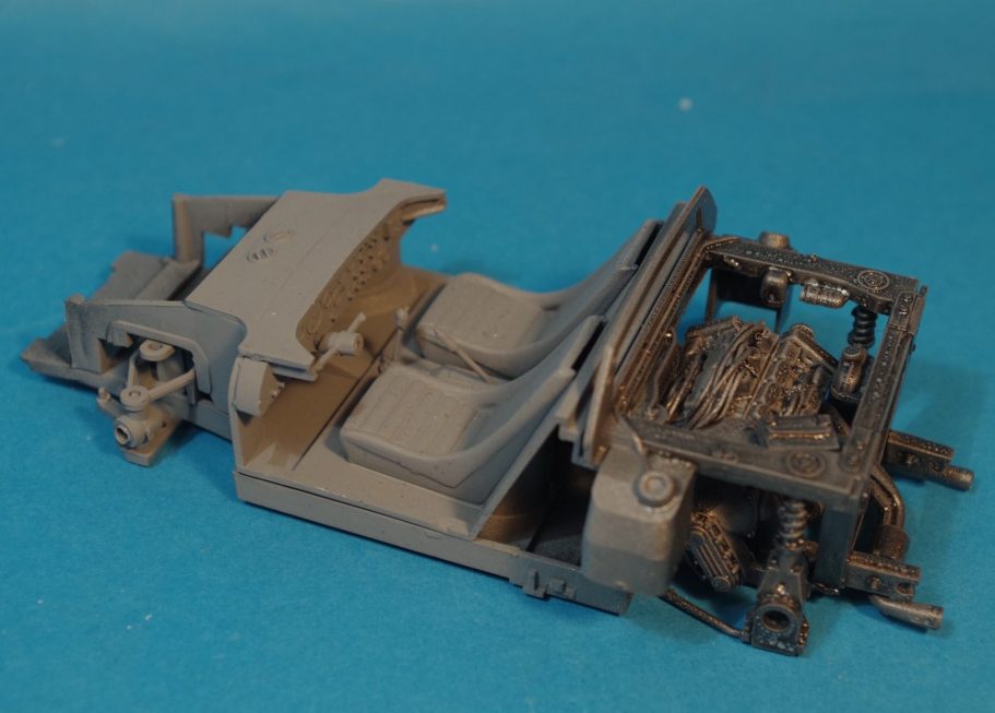 Photo #1 shows the cockpit and engine as I got them, all that I’ve done is spray on some metallic paint over the engine and some grey primer on the cockpit ready for detail painting to be started.