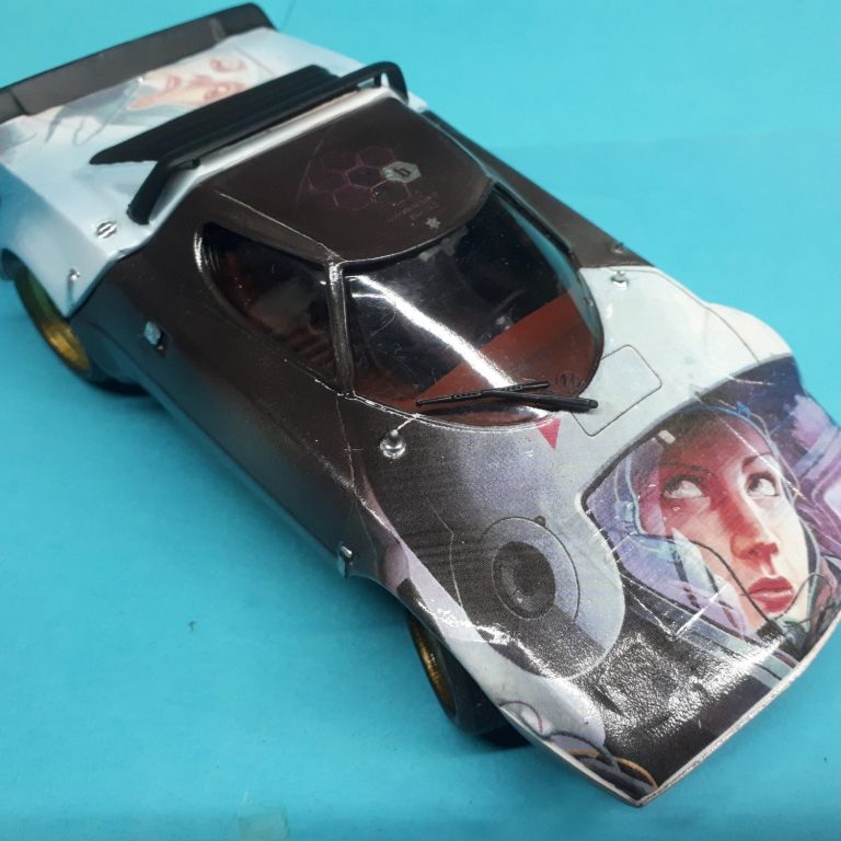 I’ve experimented with making my own decals and felt I’d been quite successful with the Tamiya Supra with it’s Derek Stenning artwork, and having been pleased with that result thought I’d try larger decals featuring Mr Stennings designs on the Stratos.
