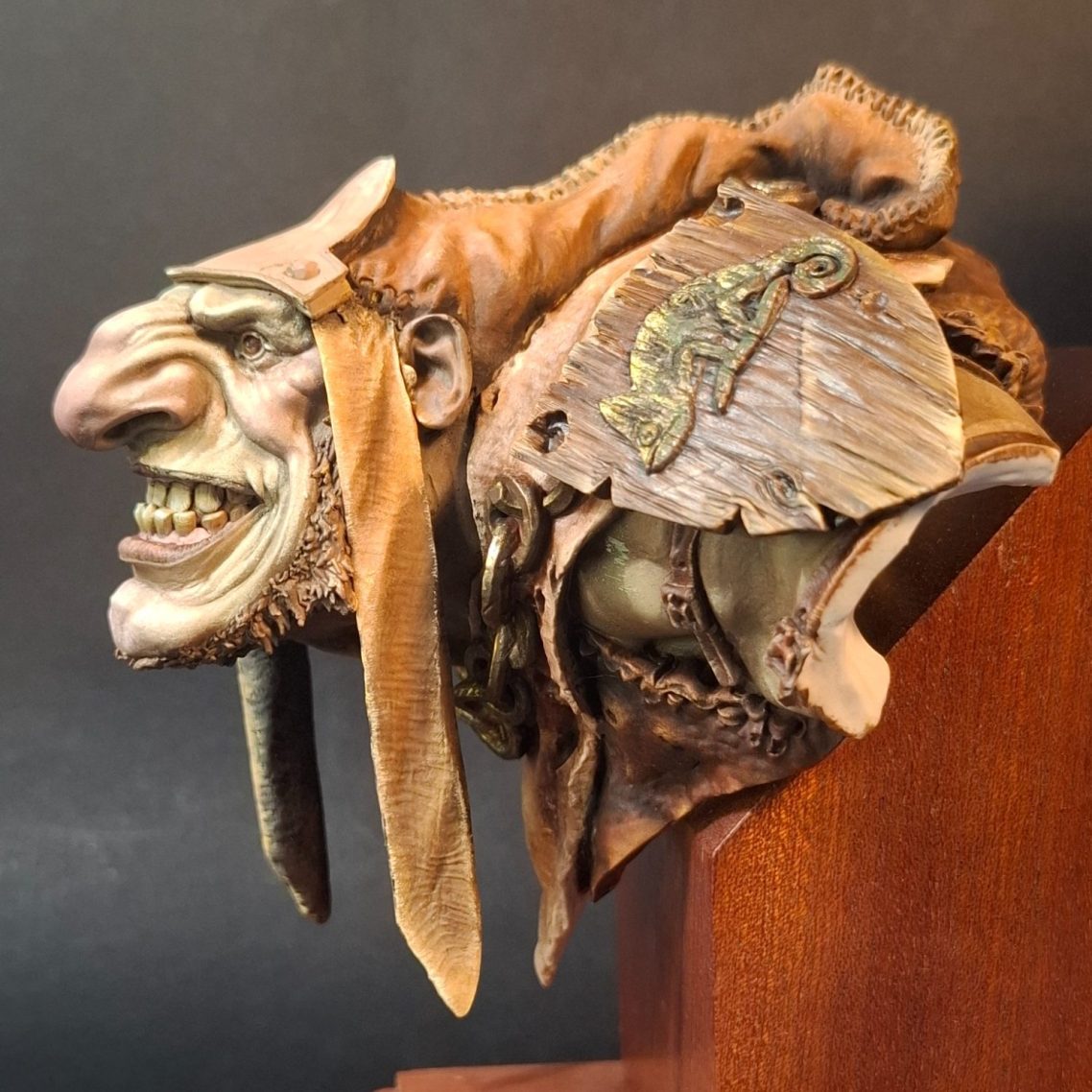 The wood was painted with various browns and the chameleon with some bronze and gold metallic, washing a couple of thinned coats of a mid green over the latter to make it look like it’s oxidised a little.