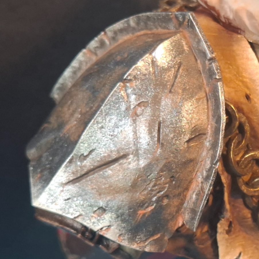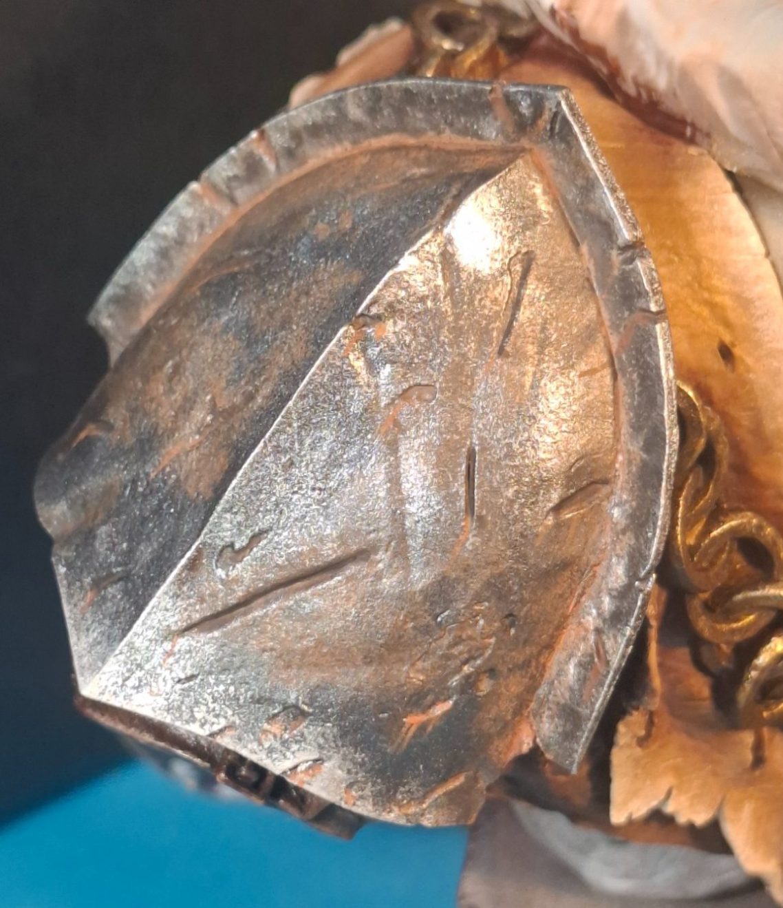 Photo #11 shows the other shoulder pad, this one having been painted to represent some badly damaged and rusting steel.