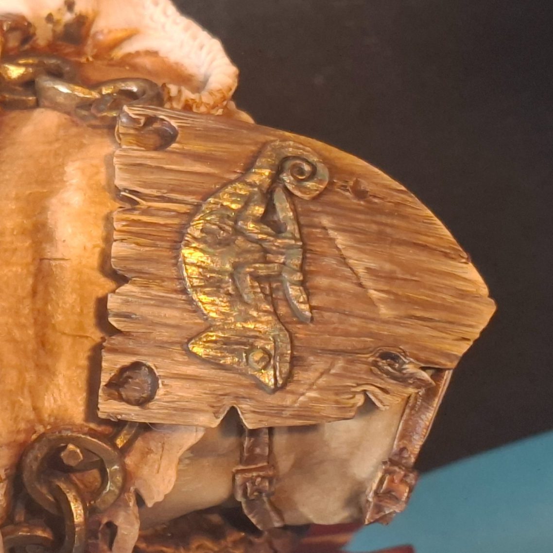 I’ve temporarily fastened the shoulder pads in place with some small blobs of Blu-tac and in this shot you can see on the wooden one where one of those little semi-circles of resin will go to join up with the rest of the necklace. Another one will be glued in place at the back to form the same kind of connection.