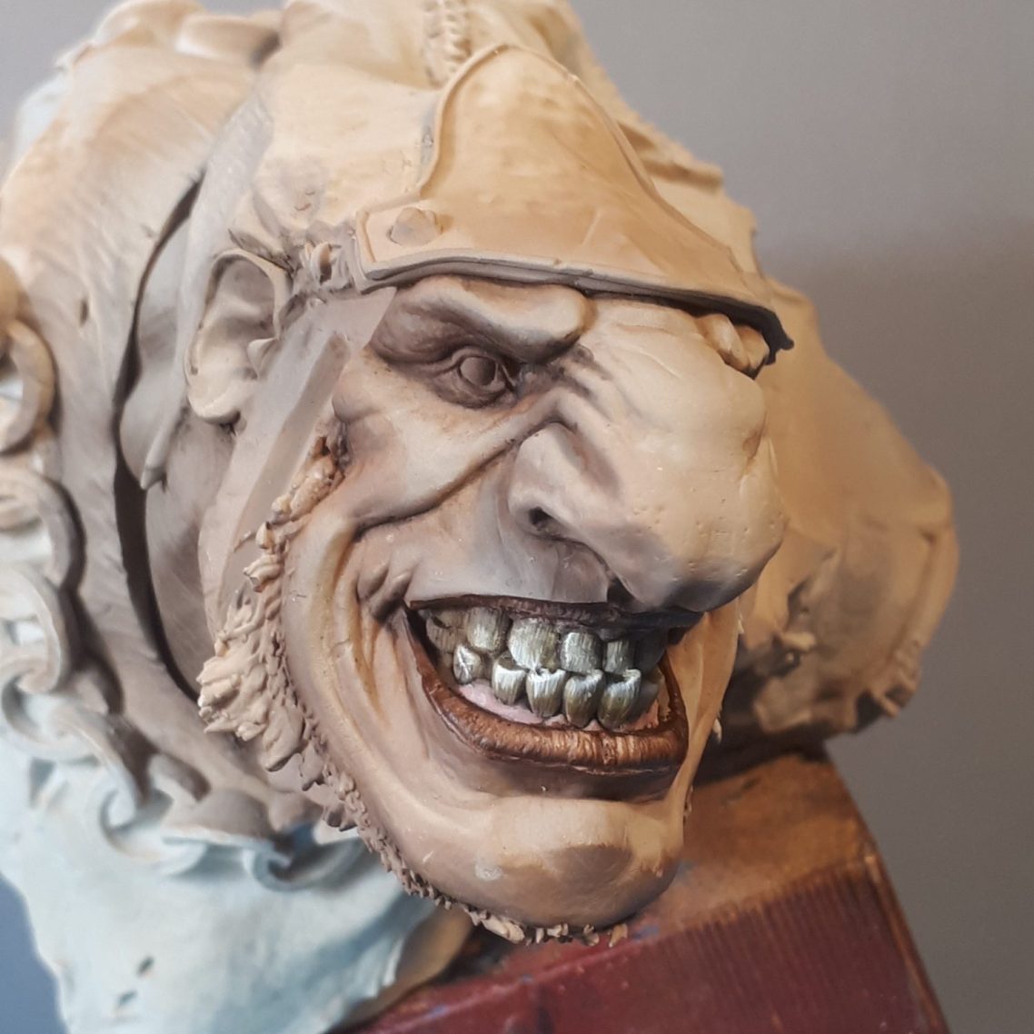 It’s relatively quick work, and gives a smooth finish as seen here, and after this it’s a case of painting in details like the lips, gums and teeth with oil colours.