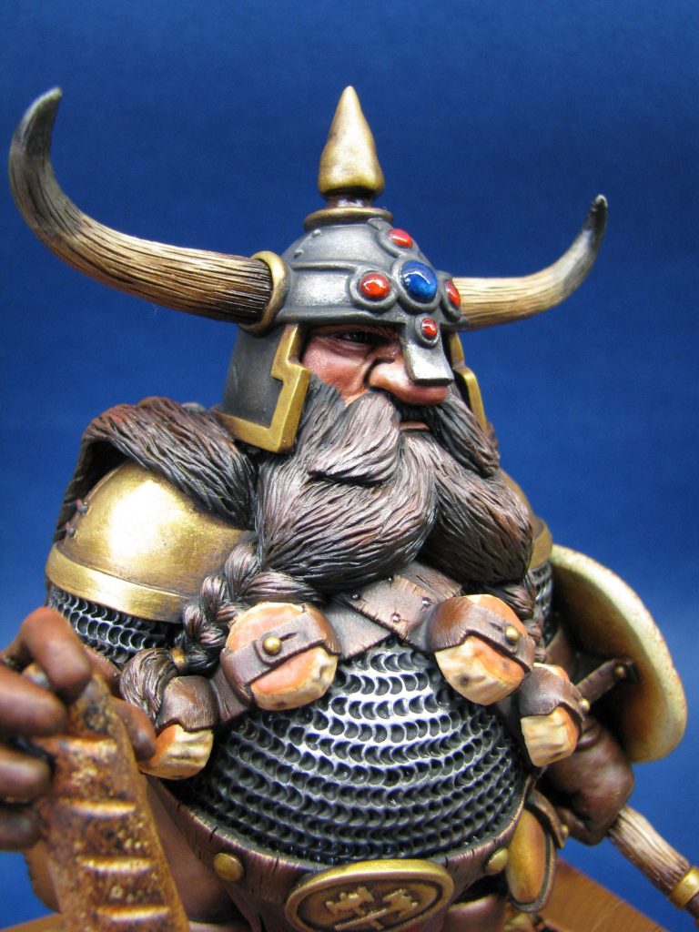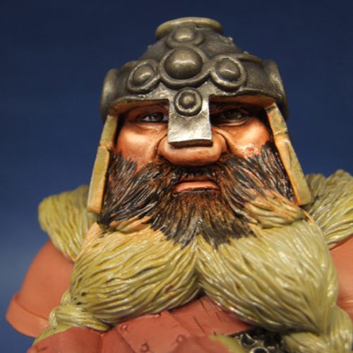 Photo #9 shows the addition of a red to the loincloth, and the beginning of painting the jewels on the helmet with red and blue acrylics. Oh, and the beard was finished off too, but that’s just more brown.