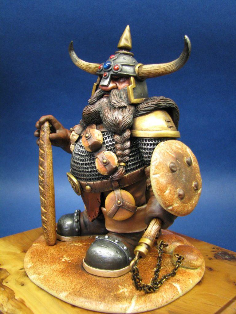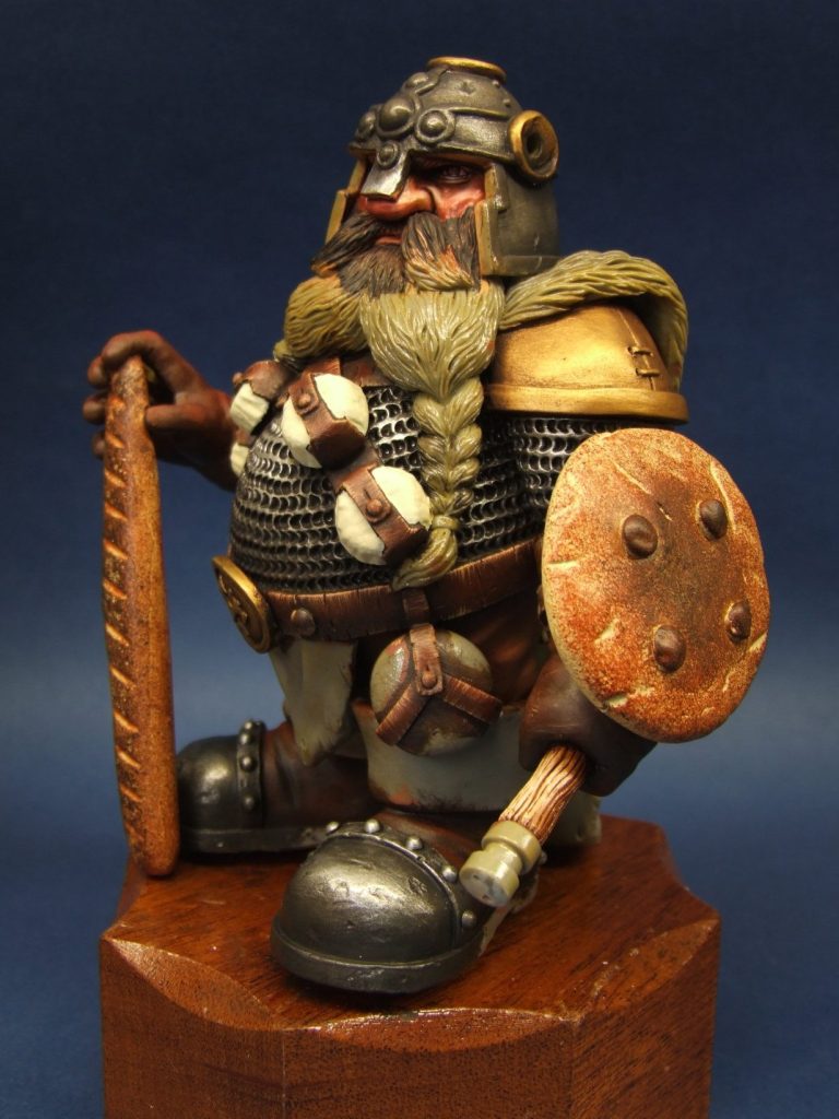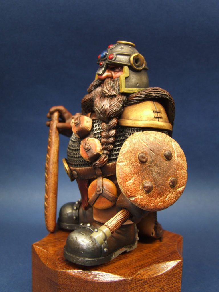 In photo #6 the model is really starting to take shape colour-wise. The shoulder pads have been painted along with the edging to the helmet with a gold coloured acrylic, adding some Burnt Umber oils to darken the edges a little, the belts, gloves and boots have been painted in to represent leather items, and the bread of the shield and Battle Baguette have been added too.