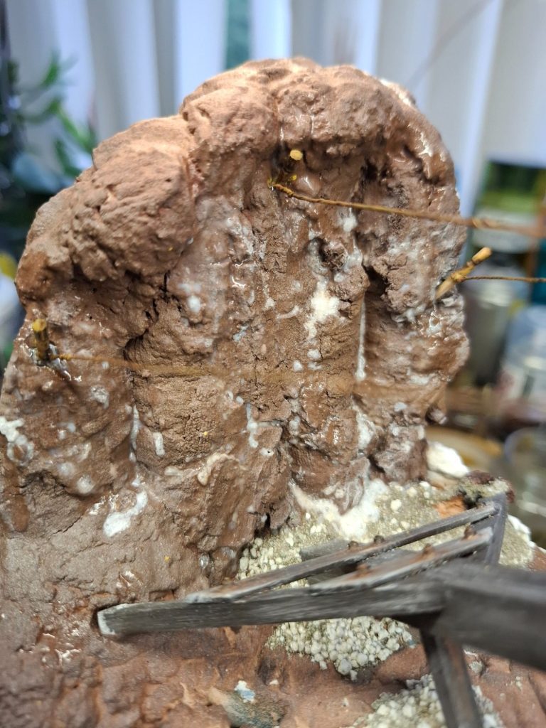 The topmost part of the cliff has the same filler used for the snow, but I added a little water from a spray bottle and smoothed the upper surface.