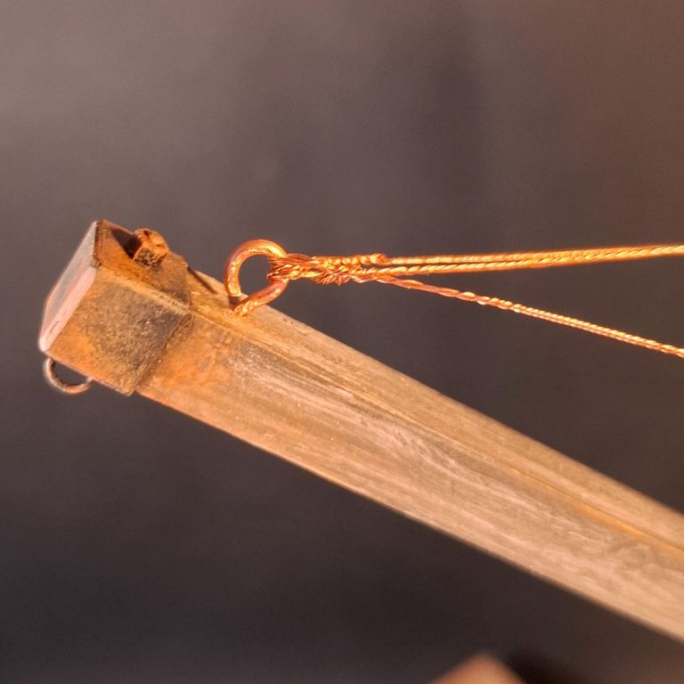 Photo #45 is a close up of the loop of wire at the end of the jib, the wires being made from stripped electrical flex, twisting two pieces together so they look like thin rope.