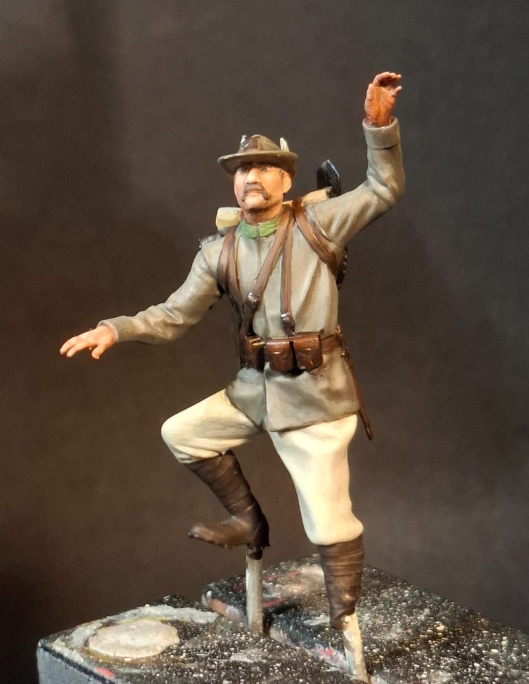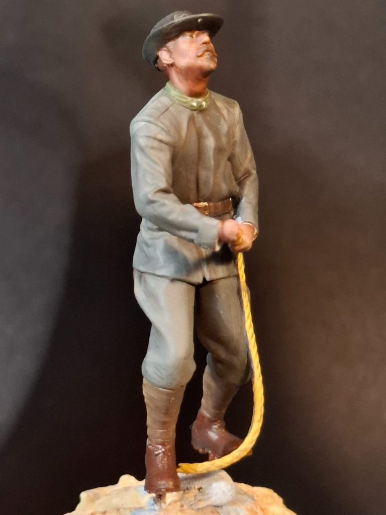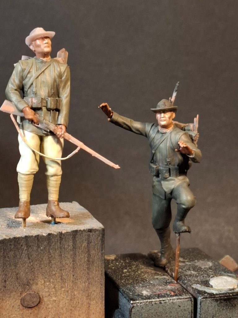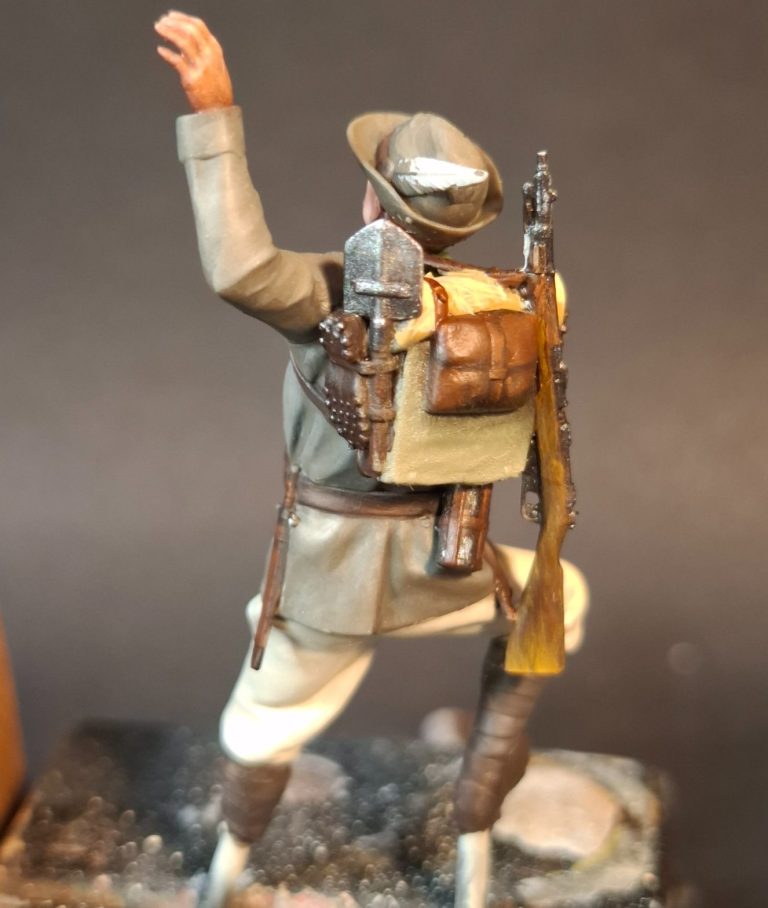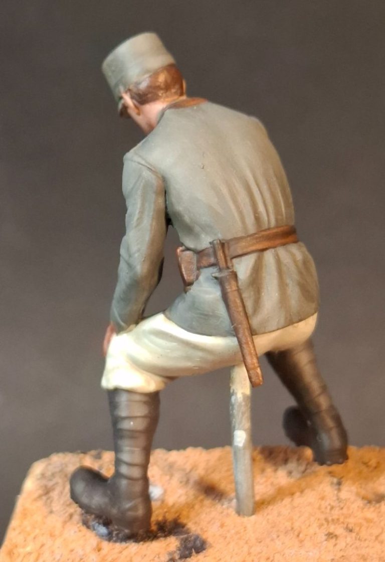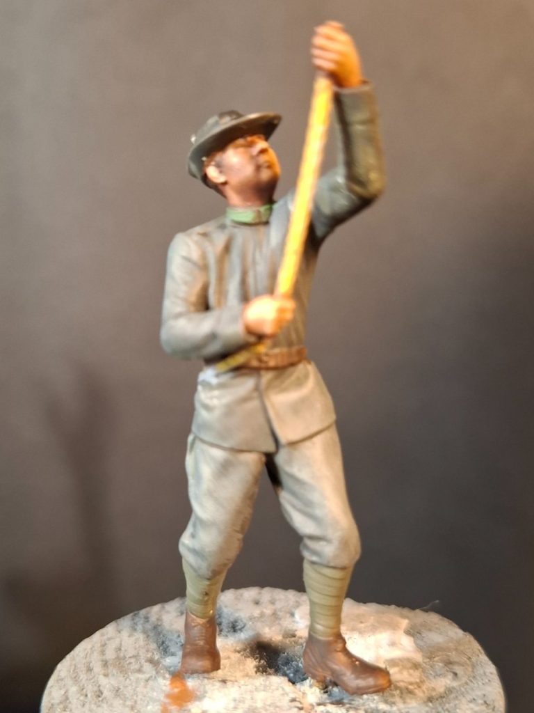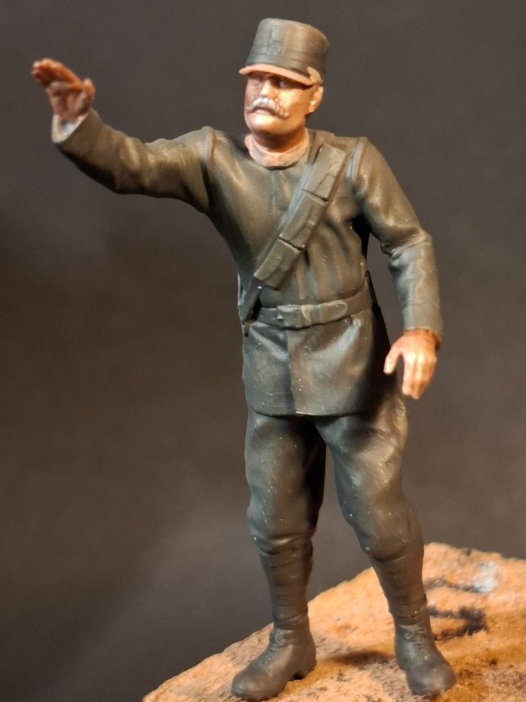 Here I’m working my way through all the figure’s uniforms, added all the details of the items they’re carrying, painting on the insignia on their hats, although this is black and barely visible, and given two or three of them rank markings on the sleeve cuffs of their jackets.