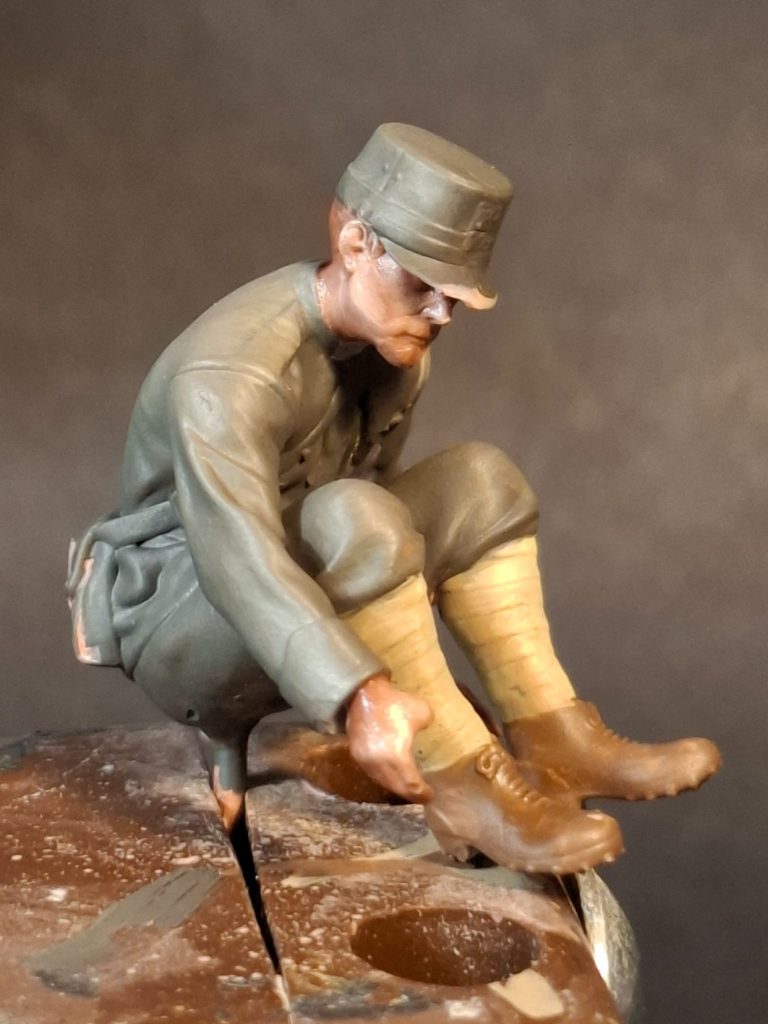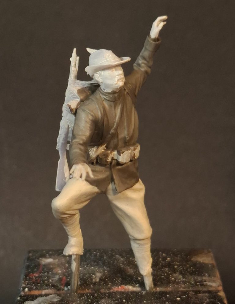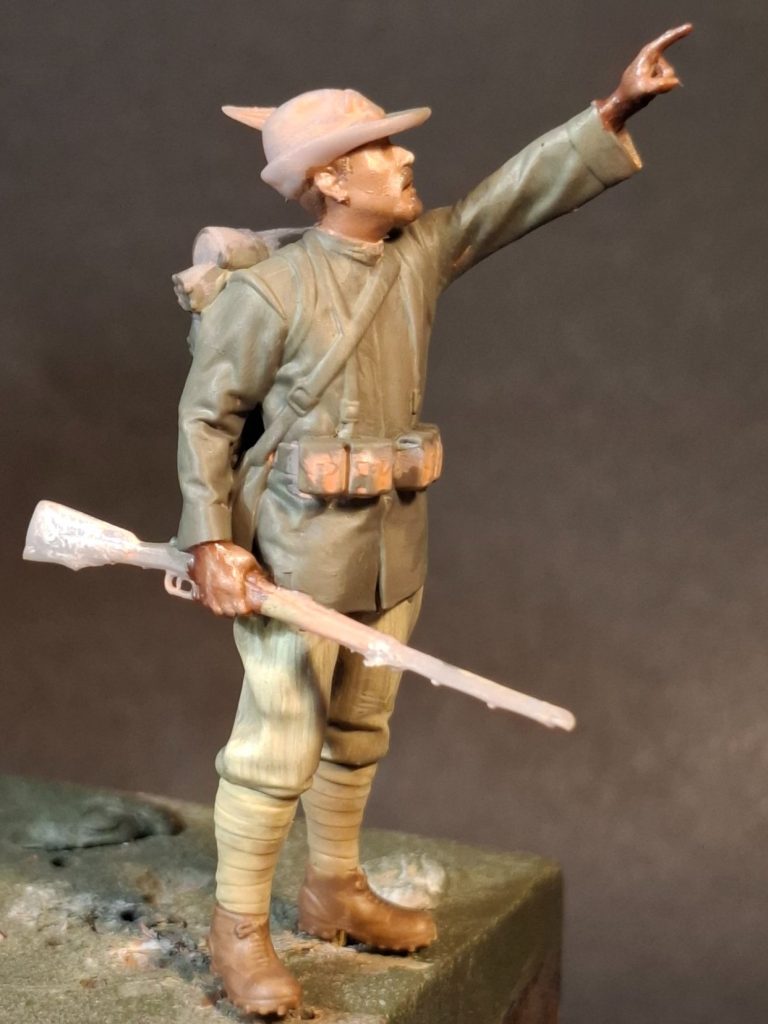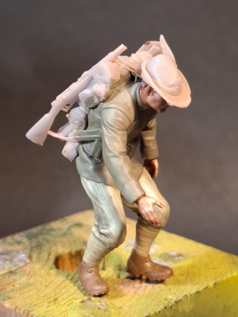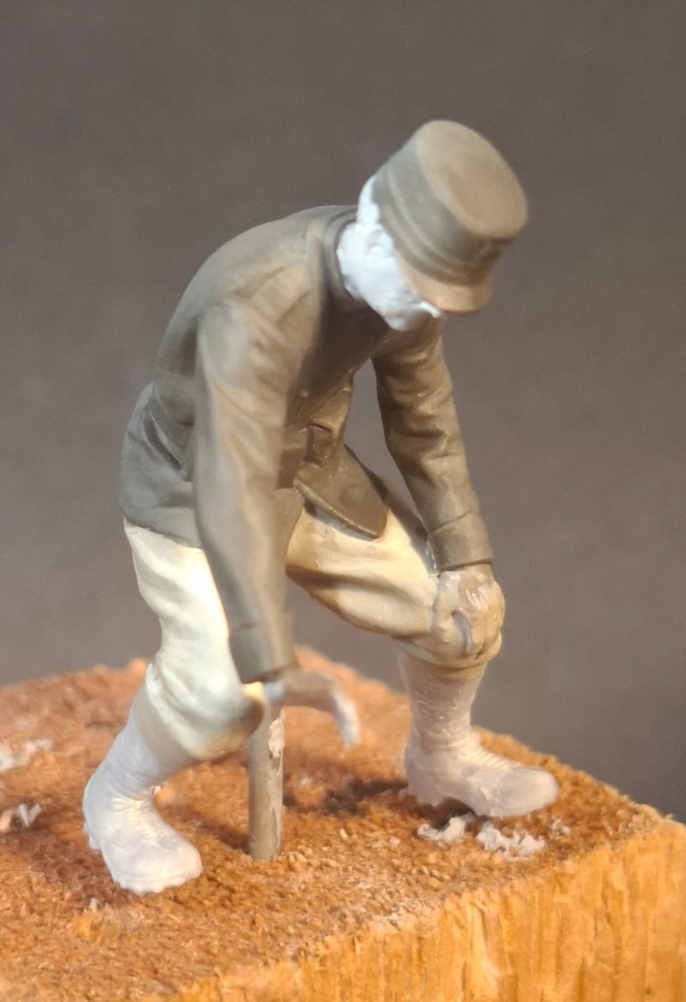 Photos #26 and #27 show the first figure to be tackled, and only really show the pale trousers and green hat and jacket in the first shot, while the details have been added in the second picture.