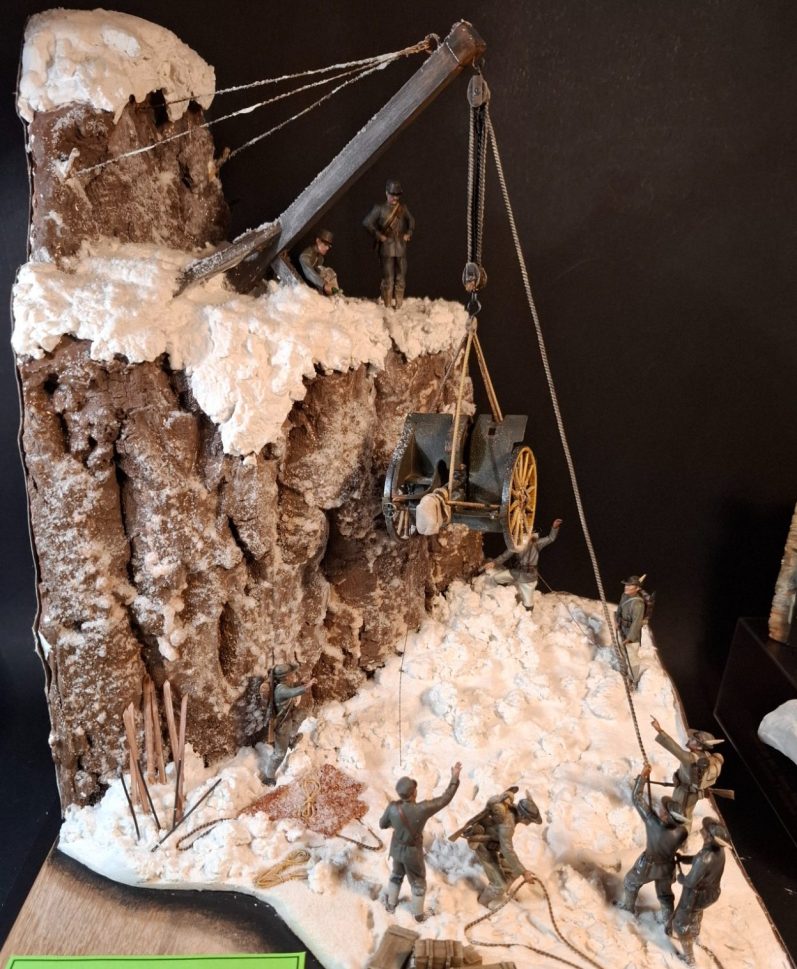 I’d put a bit of thought into this, and began with the crane jib – photo #42 – using some sand groundwork mix and superglue to securely fasten the jib supports in place on the ledge, allowing space for where the cannon would be rolled off the cliff to begin it’d decent.