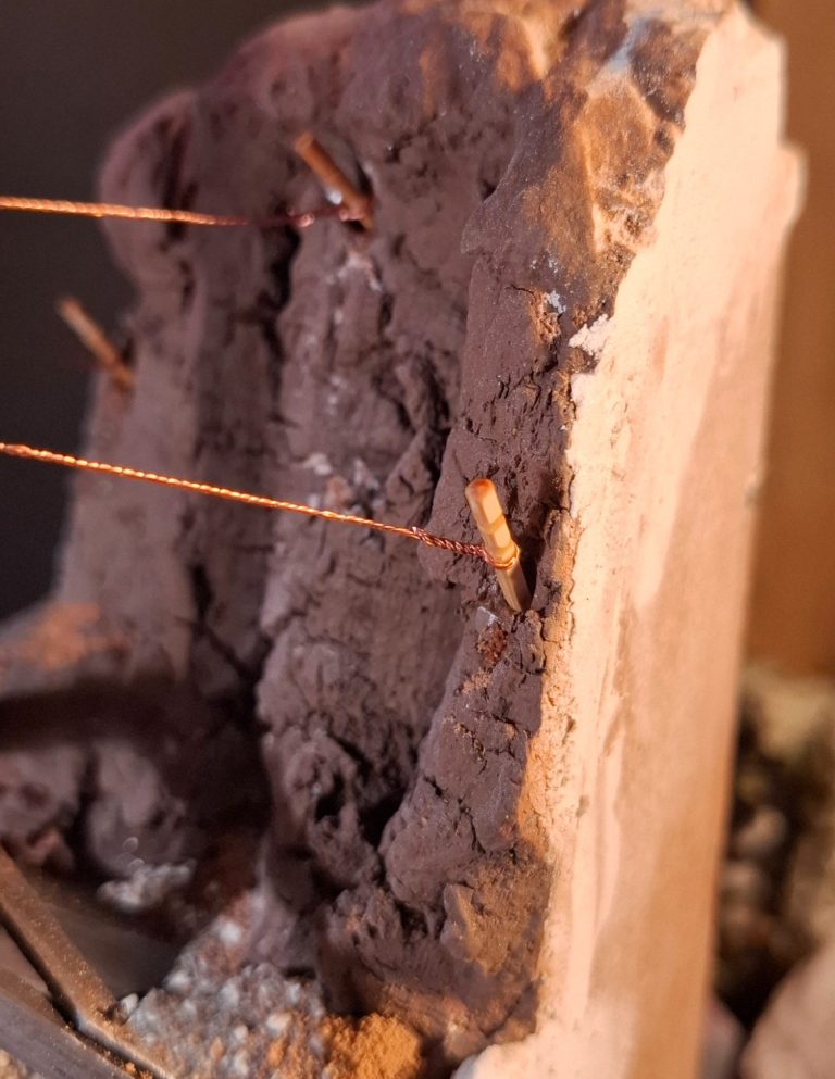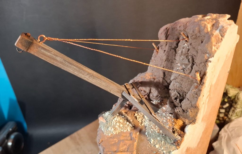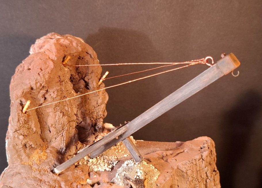 I’d added a loop of copper wire to the end of the jib, and in this shot you can see the support wires that are fastened to that and extend to pitons that would have been hammered into the cliff face above the crane.