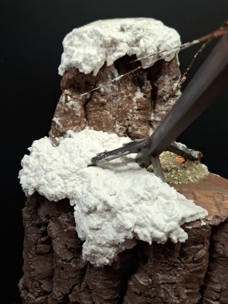 Photo #48. and for the snow I used the ready mixed wall filler, picking this out of the tub with a small trowel – actually a metal mixing spatula for oil paint – and allowing the filler to almost tear as it’s separated from the mass in the tub. This tearing action gives a rough surface texture which looks like snow that has melted enough to fall from a higher point on the cliff and drop to a resting place below.
