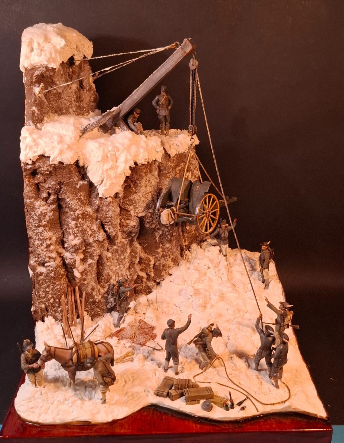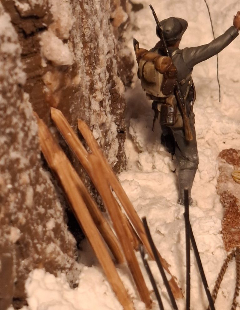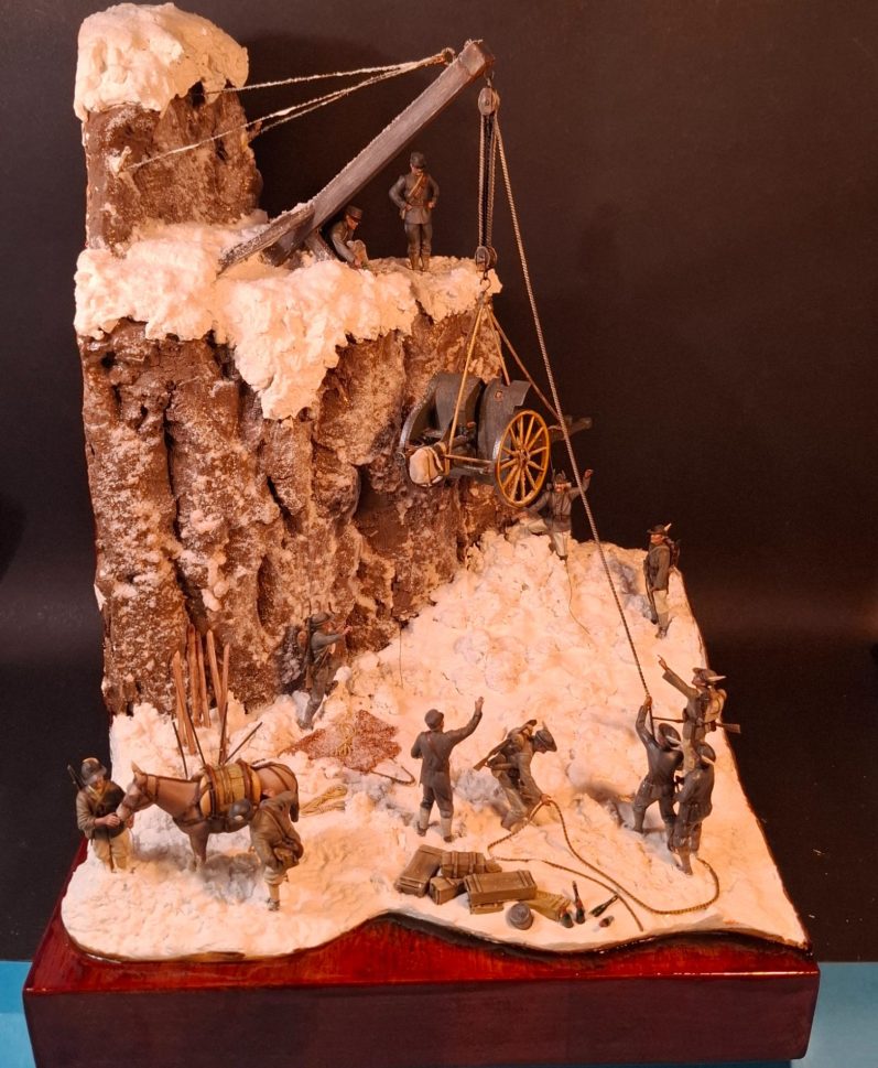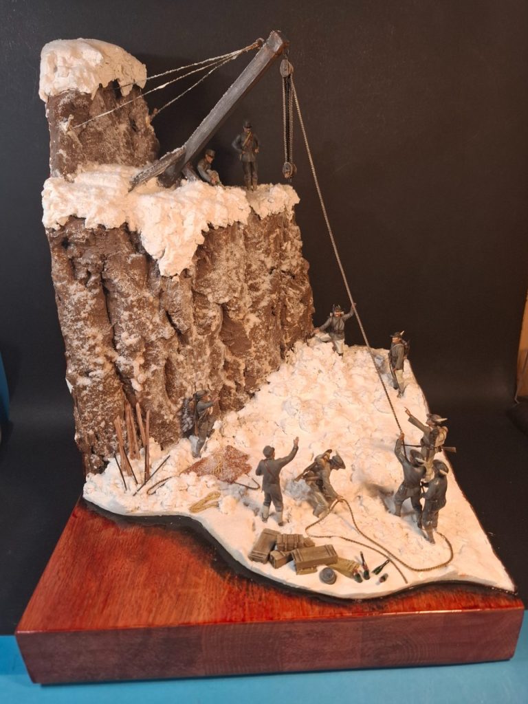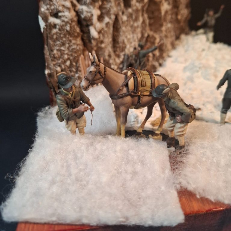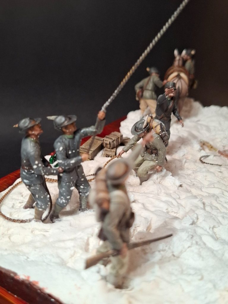 Photo #77, shows the proper “snow” added and the two figures along with the mule settled in to complete the model.