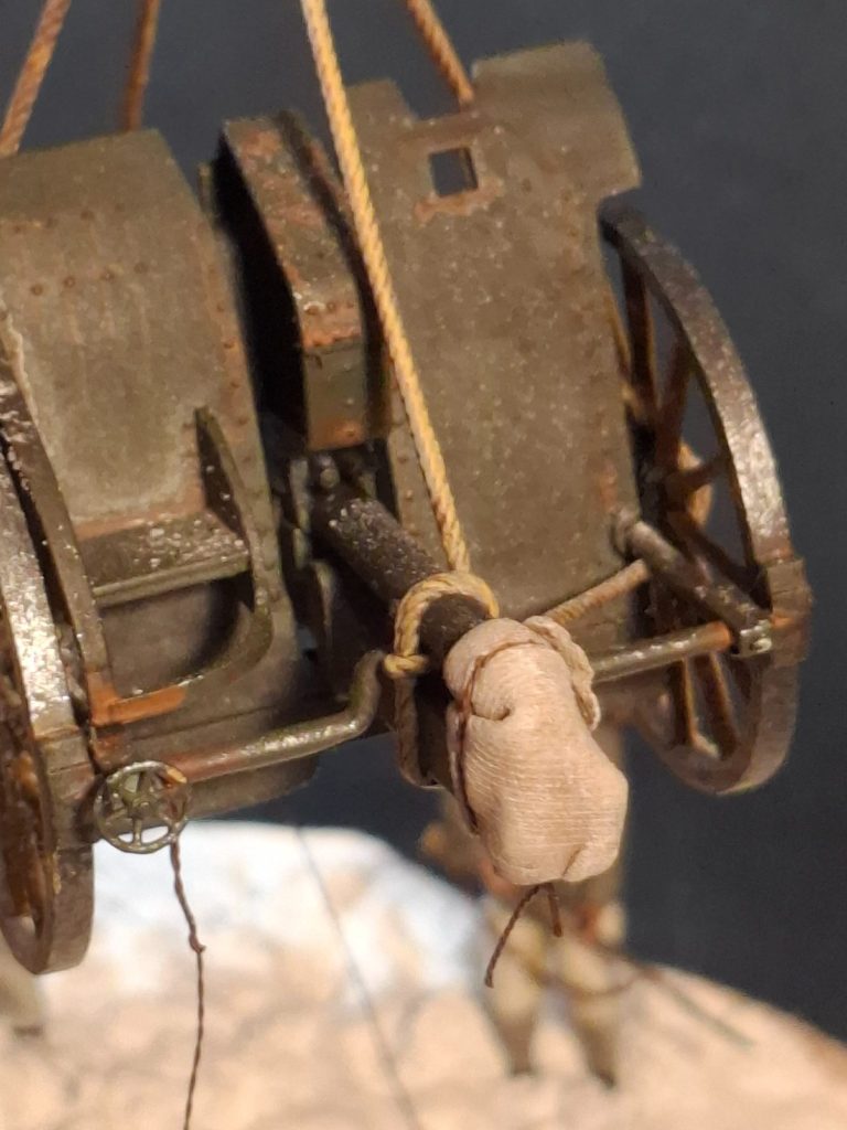 Photo #70. A cover for the open end of the cannon barrel, again my references show this, and it’s simple enough to make with a piece of rolled out putty and some wire to look like the string fastening the cloth in place.
