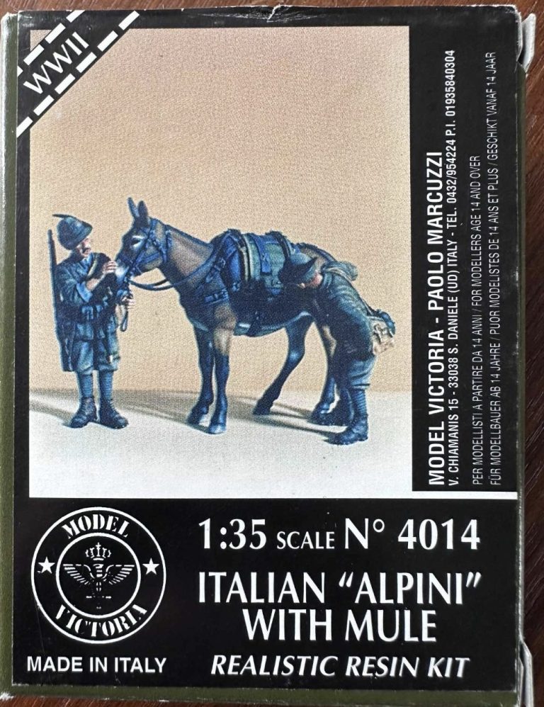 My client had found this offering of a Mule and a couple of Italian Alpine troops, and although probably aimed at the WWII period, there seemed to be little if any change to the uniform or equipment. The box art is shown in photo #71.