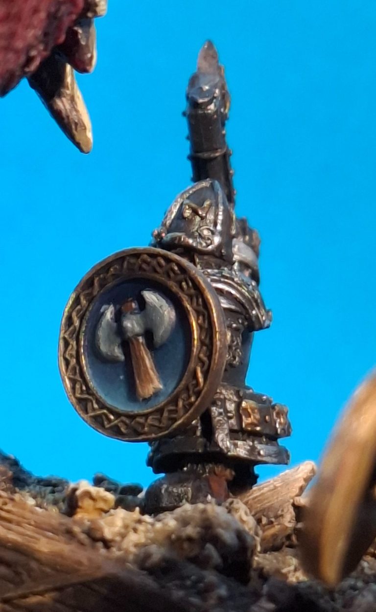The beard is slightly darker having begun with Vandyke Brown oils and there’s some Darkstar Gold been added to the decorations on the helmet, but otherwise, pretty much the same process.