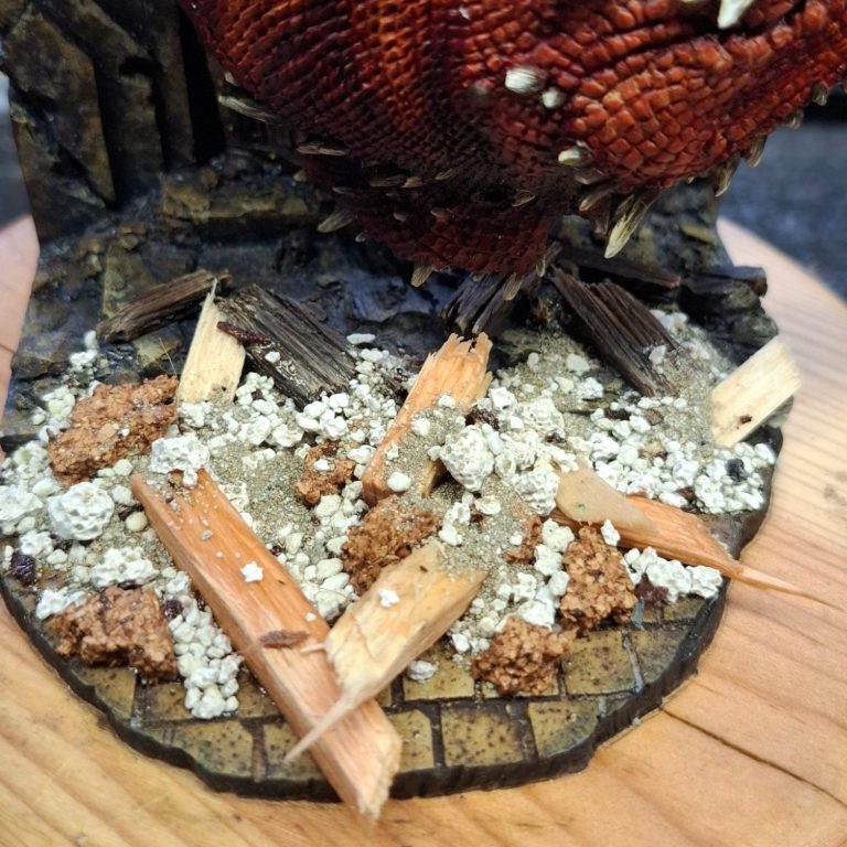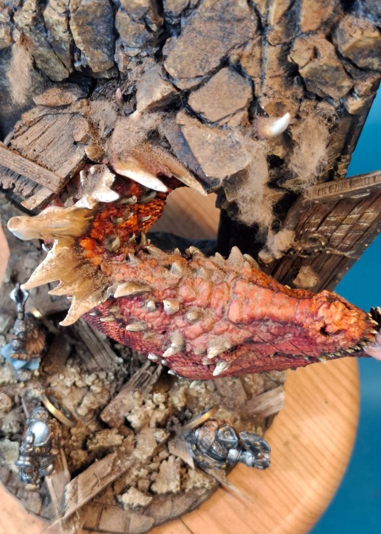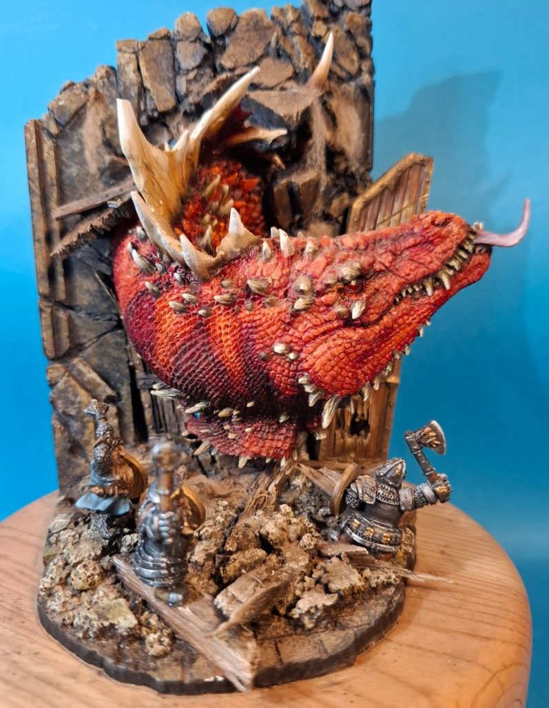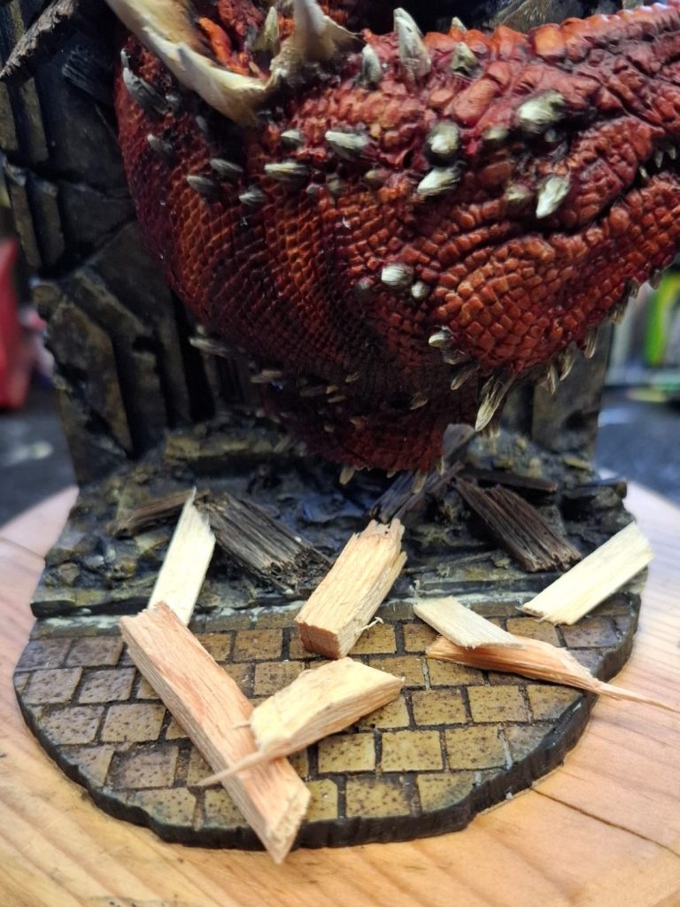 The debris was painted with various brown and cram colours to match the walls and doors, although theoretically the debris is more from the ceiling of the room that the dragon is forcing it’s way into, as there’s way too much for it to have come from the doorway.