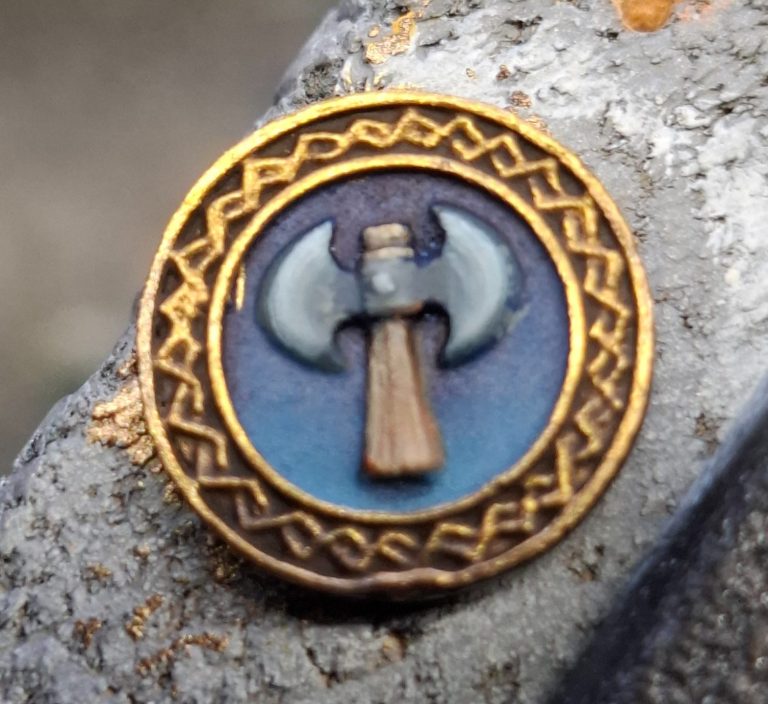 The shield – one of three – is shown in photo #30. There’s a bit of damage on the lower edge, but I left that as being battle damage from a former conflict. The Axe motif seems fitting and I painted the field behind it blue to contrast with the mass of red on the dragon. As with the faces, the shield designs aren’t going to be very easy to see, but I enjoyed doing them. On this particular shield, the gold has spilled over onto the blue at the ten o’clock position and needs to be touched back in.